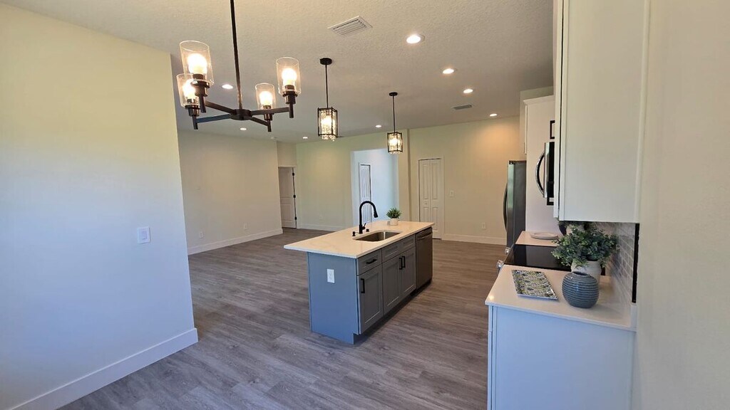 Welcome to your new home in the heart of Palm Bay, Florida! This stunning single-family residence, built in 2024, offers spacious living with 3 bedrooms with bonus room and two bathrooms, encompassed in 1,850 square feet of well-designed space. The modern exterior greet you upon arrival, leading to a bright entryway and an open-concept living area that seamlessly flows into the contemporary kitchen, equipped with stainless steel appliances and ample cabinetry. Enjoy the luxury of a master suite with a walk-in closet and a master bath featuring dual vanities and a walk-in shower. With ceiling fans throughout, comfort is assured year-round. The large backyard is perfect for outdoor activities, complemented by a covered patio for relaxation. This pet-friendly home also offers dedicated parking, central heating and cooling, and laundry hook-ups for your convenience. Don’t miss the chance to call this beautiful property yours – schedule a viewing today!
