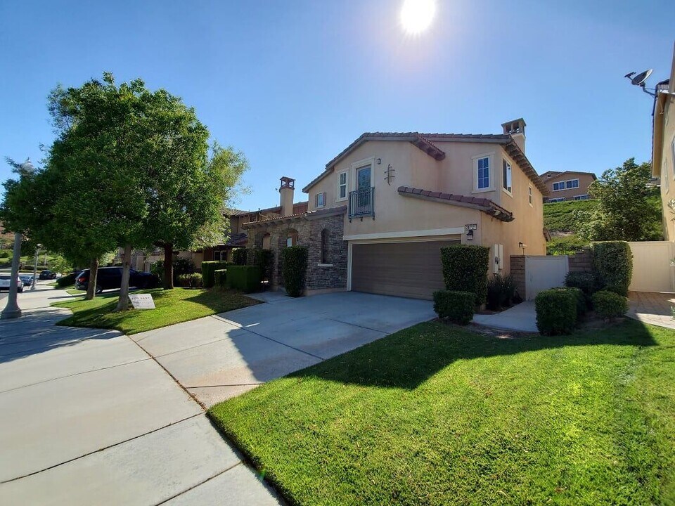 Wonderful West Hills residence for lease in the desirable West Creek community of Valencia. This CASTILLO home is ideally located just four homes away from West Creek Academy, an Honor Roll School, California Distinguished School, and California Gold Ribbon School. Situated behind a private gated entrance and positioned near the end of a quiet cul-de-sac, this home offers both privacy and convenience.The spacious floor plan features a formal living room, dining area, and family room with fireplace. The open-concept kitchen includes a center island, granite countertops, stainless steel appliances, corner pantry, and adjacent powder room.Upstairs you'll find four bedrooms, including a generous primary suite with private bathroom featuring dual sinks and an oval tub/shower combination. The front secondary bedroom offers mountain views and a charming faux balcony. A convenient upstairs laundry room adds everyday ease.Standard upgrades include ceramic tile flooring downstairs and in all bathrooms, plus granite-style bath countertops.Enjoy the beautifully landscaped backyard with a large patio area, gazebo, propane barbecue, and grassy area perfect for relaxing or entertaining. Stainless steel refrigerator, full-size washer, and dryer are included in the lease.The inviting front exterior features a large covered porch with rock accents. Residents enjoy access to West Creek HOA amenities including two resort-style pool areas, community room, and more. Gate-guarded community. A must see! All occupants over 18+ must complete application, $60.00 fee per applicant.