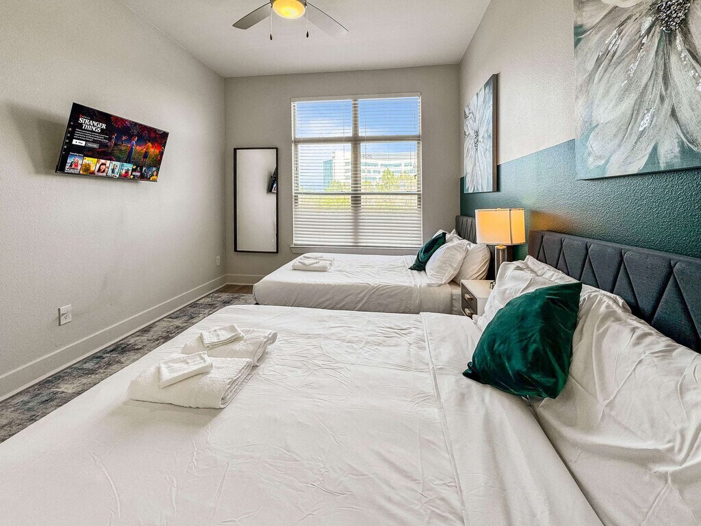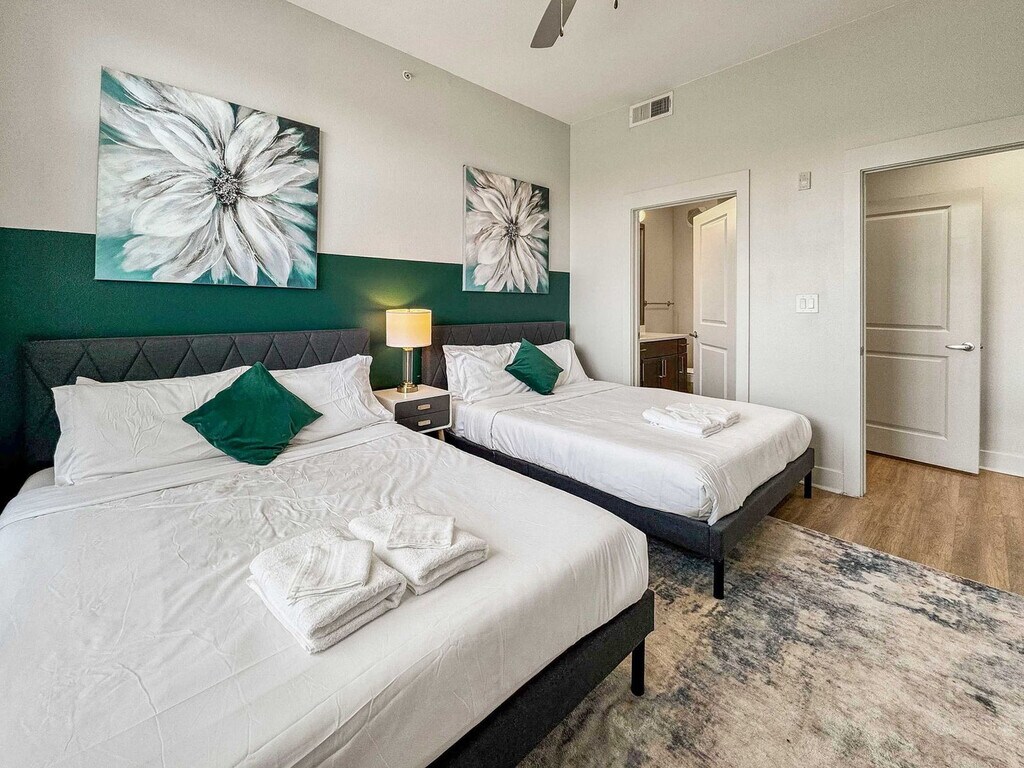 Enjoy the perfect Dallas stay in this modern and spotless 2-bedroom, 2-bath apartment with ultra-fast Wi-Fi. Rest in cozy beds, play tennis or pickleball, and explore nearby restaurants, parks, museums, and business hubs. Whether you're here for work or a longer visit, this apartment offers more charm and comfort than a hotel. Book today for a memorable experience! Welcome to this cozy and modern apartment, perfect for a relaxing, stress-free stay. Enjoy an open living and dining area with LED lighting, contemporary furnishings, and large windows offering natural light and stunning night views. Warm wood floors add a touch of comfort and charm. The living room features a sofa bed, chair, coffee table, and a 55" 4K HDR Smart TV with Netflix. Bedroom 1 offers two queen beds with luxury foam mattresses, linens, and reading lamps, while Bedroom 2 includes two full-size bunk beds (four beds). The bathroom is equipped with a full bath, shower, sink, mirror, toilet, towels, and essentials. The fully equipped kitchen includes an oven, stove, fridge/freezer, dishwasher, Keurig coffee maker, water kettle, sink with hot/cold water, glassware, and silverware. Strict cleaning protocols are followed for your safety and comfort. Pets are allowed based on size, with an additional cleaning fee per pet as follows: $25 per night for 1-4 nights, $200 for 5-29 nights, and $300 for 30+ nights. Please notify in advance to avoid cancellation. This apartment is ideally located near restaurants, parks, museums, and business hubs, making it a perfect choice for exploring Dallas. Smoking is strictly prohibited inside the property, with a cleaning fee of $500 for any violation. Check-in time is after 4 PM, and check-out time is by 10 AM. Late check-outs without prior approval will incur additional charges. Garbage must be disposed of in designated bins to avoid attracting pests. Treat the property and its contents with respect, as any damages will be charged to the guest. No mail can be delivered to the property due to security concerns. For security, surveillance cameras are installed in hallways, and a Minut device is placed in the unit to monitor noise levels. Guest verification is required before your stay, including providing a government-issued photo ID and completing verification through our portal. All guests must sign a rental agreement upon confirming the reservation. [SI]