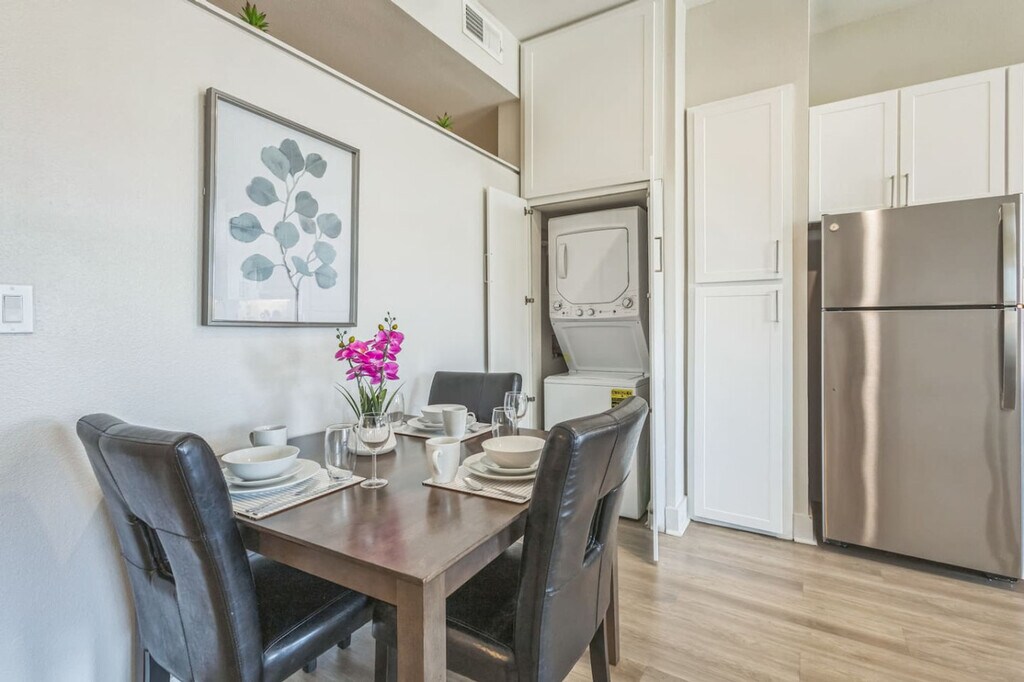Feel at home in this modern 1-bedroom apartment in Deep Ellum, Dallas' Arts & Music Hub. The apartment is near the Medical District, Baylor University Medical Center, the Dart Train, and Children’s Hospital. This urban-designed, fully furnished apartment features a full kitchen with a Keurig, complimentary coffee and tea, a refrigerator, freezer, stove, oven, and microwave. It also includes central A/C and heating, dedicated Wi-Fi, a 4K HDTV with Roku in the living room and bedroom, basic toiletries, towels, linens, bed pillows, blankets, hangers, an iron, an ironing board, and an in-unit washer and dryer. Enjoy access to the sparkling pool and the fully equipped public gym with exercise equipment. A pack-n-play and highchair are available in the unit. Free parking is available for one vehicle. Pets are welcome on a case-by-case basis for a fee starting at $50 per pet per night, up to a maximum of $175 per pet per month. No cats are allowed. Located in the central area of Deep Ellum, the apartment is close to all the action. The John F. Kennedy Memorial Plaza & Dealey Plaza are 2 miles away, as is the Dallas Downtown Historic District. Baylor University Medical Center is 0.6 miles away, and the Baylor Station is located at the back of the apartment complex. The Medical District (Parkland, UT Southwestern & Children’s Hospital) is 4.5 miles away. Other nearby attractions include the George W. Bush Presidential Center (5 miles), the American Airlines Center (2.8 miles), the Cotton Bowl Stadium (1.2 miles), and the AT&T Stadium (20 miles). Dallas Love Field Airport is 8 miles away, and Dallas/Fort Worth International Airport is 20.9 miles away. The Malcolm X at Junius Bus Stop is a 3-minute walk away. This apartment is located in a city/urban setting, and there is potential for residual noise from many different areas of the building. The Dart Train Station is directly next to the building and will cause overnight turbulence, occasional horns, and noise. Pets are not allowed on the property at any time without prior written consent, and guests are responsible for cleaning up after their pets both indoors and outdoors. Excessive noise, aggression, or any other disruptive behavior from pets may result in the immediate termination of the booking without a refund. Smoking of any kind will result in a $1000 charge, and a cleaning fee may be assessed if necessary, including a $500 ozone treatment. Unauthorized late check-out will be charged $75 for every 30 minutes after the standard check-out time. Lost keys, key fobs, or parking access swipe cards will result in a $300 charge to replace and rekey the apartment complex. Lost parking pass tags will result in a $200 charge to replace and rekey. Failure to send a photo of any associated parking passes, keys, key fobs, garage remotes, or swipe cards will result in a $100 charge. Includes a dedicated workspace and a business center. [SI]