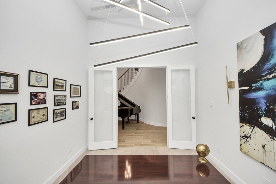 Beautiful two-story home featuring 5 bedrooms, 4.5 baths, and a 3-car tandem garage. The elegant double front door entry opens to a private study with French doors and a bright, open-concept family room. The spacious island kitchen offers quartz counters, white cabinetry, black hardware, and a walk-in pantry, flowing into the informal dining area. The first floor includes a luxurious primary suite with two large walk-in closets plus a secondary bedroom with a private ensuite bath. Upstairs features a spacious game room open to the living room below, an enclosed media room, and three additional bedrooms one with a private vanity connecting to the Jack-and-Jill bath plus a separate full guest bathroom. Enjoy a covered patio and a large backyard with no rear neighbors. Located in The Trails, offering miles of paths, resort-style pool, splash pad, playgrounds, and more, just minutes from The Woodlands and Lake Houston.