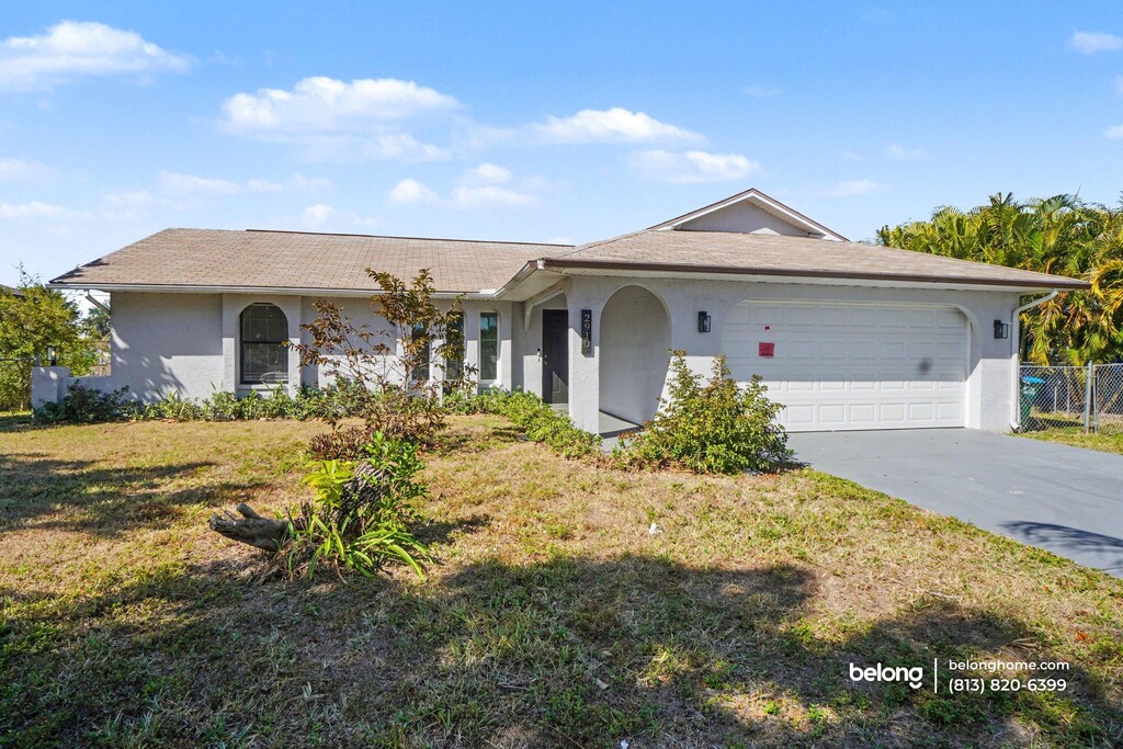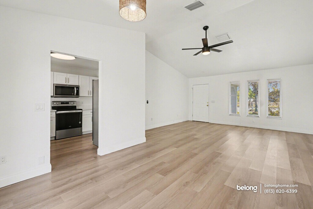 Positioned in Cape Coral’s sought-after Gold Triangle, this bright, open-concept home offers three bedrooms and two baths with golf course views greeting you right out front. Generous natural light and a practical layout make this a smart choice for anyone prioritizing space, comfort, and location. Living areas feel open and flexible, allowing you to arrange seating, dining, and gathering zones with ease. Wide flooring spans the main spaces, while ceiling fans add everyday comfort and circulation. Sightlines connect seamlessly into the kitchen, supporting both daily routines and casual entertaining. The kitchen is thoughtfully arranged with ample cabinetry, generous prep surfaces, and full appliances, creating a functional hub that keeps everything within reach. Outside, the backyard includes a swimming pool that is permanently covered and maintained for safety and peace of mind, allowing the space to function as a secure patio area. A spacious garage adds valuable storage and parking flexibility. Located along Country Club Boulevard, you are minutes from Cape Coral Yacht Club Beach, Four Freedoms Park, and downtown dining along SE 47th Terrace. Grocery options like Publix and ALDI, local cafes, waterfront restaurants, and quick access to bridges into Fort Myers make this address a practical and compelling choice. *Three pets allowed. Pet weight limit is 30 lbs - if your pet exceeds this, please reach out to see if we can accommodate! *Our homes come as-is with all essentials in working order. Want upgrades? Request it through the Belong app, and our trusted pros will take care of the rest!