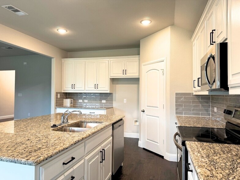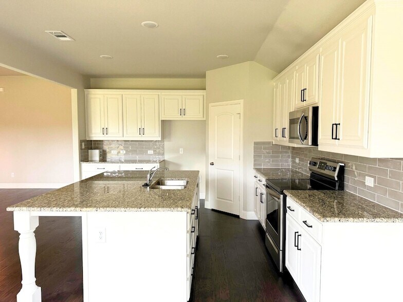 Great brick home in gated subdivision facing the lake across the street. Enjoy the beautiful view from the front porch or the office while you work! This 3 bed, 2 bath home features an open concept living-kitchen area with a corner fireplace and beautiful flooring throughout. The kitchen is huge, boasting granite counters, tons of cabinets, big pantry, and an enormous island. Lots of windows in the breakfast room and living room bring in natural light creating an inviting atmosphere. Master suit has a large en-suite bathroom with soaking tub and separate shower plus a walk-in closet. Both guest bedrooms are a nice size with great closets. Large laundry room and 2 car garage finish out the inside of this property. Outside has a cover back porch overlooking the fenced backyard. This one is the perfect place to call home. Tenant pays all utilities. Tenant to provided their own refrigerator and washer-dryer. No pets. Security deposit and first month's rent due upfront.