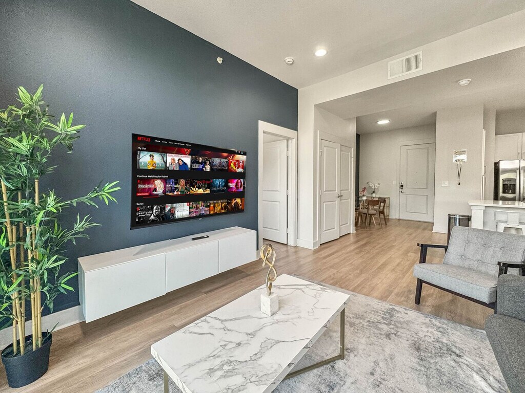 Located in the vibrant heart of Deep Ellum, this Dallas retreat offers the perfect blend of comfort and convenience. Modern, spotless, and complete with high-speed Wi-Fi, the space is designed for both relaxation and productivity. Rest easy in a plush queen bed and take in breathtaking views of Downtown Dallas. With top restaurants, lively nightlife, cultural museums, and green parks nearby, the location is unmatched. Skip the usual hotel rooms and standard rentals and make your stay truly memorable here today. Step into this elegant and contemporary 2-bedroom, 2-bath apartment, crafted with style and comfort in mind for an effortless stay. The open-layout living and dining area showcases modern LED lighting and chic furnishings, offering both sophistication and a welcoming vibe. Expansive windows fill the bedrooms with natural light and city views, while polished wooden floors add warmth and charm. Unwind in a cozy lounge area featuring a plush sofa with a coffee table and a 55” HDR Smart TV with Netflix. Your private retreat includes a queen-size bed with a luxury foam mattress, a 45” HDR Smart TV with Netflix, a walk-in closet, bedside lamps, a desk, and a chair. The second bedroom is perfect for restful nights, offering two queen-size beds with soft foam mattresses, a walk-in closet, and reading lamps. A fully equipped kitchen is ready for any meal, featuring a stove, oven, fridge/freezer, dishwasher, Keurig coffee maker with supplies, water kettle, sink with hot and cold water, cookware, glassware, and utensils. Your health and peace of mind are important, with enhanced cleaning practices followed after each guest. Pets are welcome based on size, with a pet cleaning fee of $25 per night for 1–4 nights, $200 total for 5–29 nights, and $300 total for 30+ nights. Please notify in advance to avoid cancellation. Guest verification is required before check-in, which may include providing a valid government-issued photo ID, confirmation of contact details, secure portal verification, and in some cases, a background check. Information is used only for screening and never stored beyond verification. Guests must sign a rental agreement upon reservation approval, agreeing to rental terms and conditions, submitting a valid ID before check-in, and completing the verification process to receive check-in details. Verification must be completed within 24 hours of booking, or 1 hour for same-day reservations, to avoid cancellation. For your safety, the property includes hallway security cameras and a Minut device monitoring indoor noise levels.