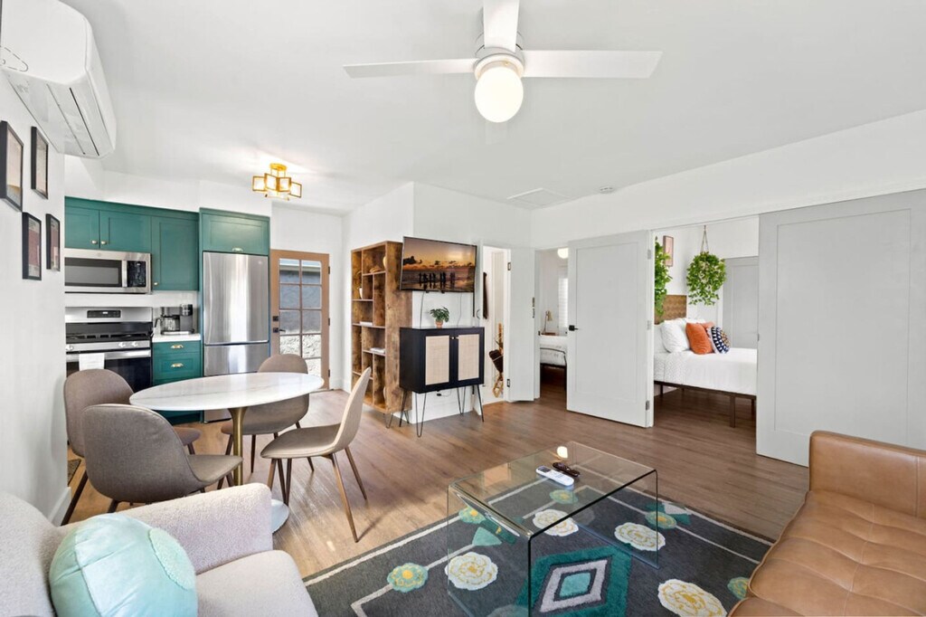 Welcome to your home away from home on Polk Avenue, San Diego! Introducing "Urban Casita" – nestled in one of the city's most vibrant areas, this beautiful back unit offers an ideal retreat for couples or solo travelers looking to explore all that San Diego has to offer. Enjoy a private entrance through the gate marked "B" and a large shaded patio with a garden and seating area. The stylish interior features boho accents, a kitchenette with countertop appliances, and a cozy bedroom with a queen bed and large closet seamlessly integrated with the living area. Step inside to find a bright yellow door welcoming you into an open living space featuring a brown leather couch with boho accents, dining for two, and a kitchenette. While the unit doesn't have a full kitchen, you'll have access to countertop appliances including an air fryer, Keurig, tea kettle, and hot plate. A fridge and freezer are also available for your convenience. The bathroom is adorned with delightful pink sunset-inspired accents, adding a touch of whimsy to your stay. We welcome one dog only (up to 60 lbs) for a fee of $100 per stay. This fee helps cover the additional cleaning required for pet hair. If any waste beyond hair (such as urine or feces) is found, an additional $200 cleaning fee will be charged. Guests are responsible for cleaning up after their pet, and dogs should not be left unattended in the home, as barking may disturb neighbors. City parking is available, but there is no on-site parking. Guests must find available street parking and adhere to all posted street parking signs. Situated in a lively neighborhood, you're just a short walk from grocery stores, restaurants, bars, and nightlife. North Park is known for its vibrant and eclectic atmosphere, characterized by a mix of historical charm and modern conveniences. This neighborhood is popular among young professionals and artists due to its lively arts scene, array of local craft breweries, trendy restaurants, and coffee shops. North Park is also recognized for its walkability, bike friendliness, and easy access to public transportation, making it convenient to get around without a car. The vicinity of Polk Avenue is primarily residential but is close to major streets like University Avenue and El Cajon Boulevard, which are lined with shops, eateries, and services. Guests should expect some noise typical of urban neighborhoods, adding to the authentic city experience. Guests are asked to be mindful of outdoor noise during quiet hours. The main house and casita each have a private fenced entrance; guests should use their designated entrance to enter and exit the property. Guests in the casita will not have access to the large trash bins, as these are within the fenced area of the main unit. Trash can be disposed of in a metal outdoor trash can. If the trash becomes full during their stay, guests should alert our team to coordinate its removal. We offer a completely contactless check-in process. Regardless of your arrival time, you'll be able to access the property at your leisure, day or night. Quiet hours are from 10 PM to 10 AM. Excessive noise or disturbances may result in immediate eviction without refund. Smoking or vaping is not allowed indoors, including cigarettes, marijuana, or e-cigarettes. Any cleaning or damage costs will be charged to the primary guest. Late checkout may result in a fee of up to $200 unless approved in advance. Fines may apply for violations of house rules or city ordinances, including Code Enforcement penalties. [SI]
