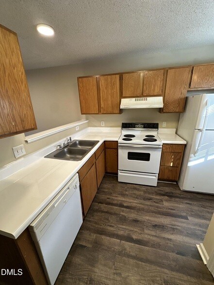 2 bedroom 1.5 bath townhouse featuring vinyl flooring throughout the first floor. The kitchens equipped with a refrigerator, range, and dishwasher.