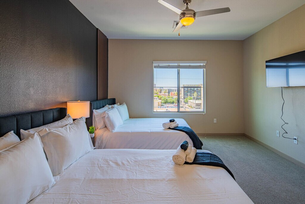Discover the best of Phoenix in this modern and stylish 2-bedroom apartment. Nestled in a quiet neighborhood yet just minutes from lively pubs, bars, top-rated restaurants, and local shops, this apartment offers the perfect blend of comfort and convenience. Ideal for both business and leisure, this cozy retreat lets you explore the city by day and return to a peaceful space designed for rest and recharge. Unwind in this beautiful 2-bedroom unit, designed for both comfort and style. The open-concept layout seamlessly connects the living, dining, and kitchen areas, offering a modern and spacious home away from home. The living room is thoughtfully furnished, featuring a sofa bed, a 4K 55" HDR Smart TV, and a coffee table. The fully equipped kitchen includes a microwave, stove, oven, refrigerator/freezer, dishwasher, toaster, coffee maker, and dining table with chairs. Each bedroom is equipped with Smart TVs, reading lamps, and comfortable beds, ensuring a restful stay. Includes one parking space, with instructions for printing the parking pass provided in your check-in details. Pets are welcome depending on size and type, or if they are certified service animals, with an additional cleaning fee of $25 per night for stays of 1–7 nights, $200 flat fee for 8–29 nights, and $300 flat fee for 30+ nights. Unauthorized pets will incur a $500 fee. Early check-in or late check-out is available for $25 per hour if requested at least 24 hours in advance. Lost or unreturned keys will incur a fee of $80, and lost or unreturned key fobs will incur a fee of $150. Welcome to Downtown Phoenix, AZ, where modern living meets cultural charm. Located in the heart of the city, this apartment places you steps away from vibrant art, dining, and entertainment. Explore the Roosevelt Row Arts District, famous for its eclectic galleries and lively cultural events. Savor diverse flavors from trendy cafes to upscale dining, and enjoy chic rooftop lounges and lively bars. Chase Field and Footprint Center are just minutes away, perfect for catching a game or concert. Nearby Hance Park offers a lush escape with walking paths and open green spaces. With easy access to light rail stations and major highways, exploring Phoenix and beyond is a breeze. Quiet hours are from 10:00 PM to 8:00 AM daily. Any noise complaints or violations may result in immediate booking cancellation and removal from the property without refund. A strict no-party policy is enforced, with security cameras and noise monitors in place. Hosting a party will result in police involvement, immediate removal, and no refund. No unauthorized guests are allowed, with a $100 fine per guest if discovered. Smoking is strictly prohibited anywhere on the property, including balconies and common areas, with a $500 fine for violations. Unauthorized late check-out will result in a $500 fine. Guests must follow parking instructions provided in the check-in guide. Bringing an unapproved pet will result in a $500 fine. Extra cleaning fees will be charged if the property is left excessively dirty. The apartment is equipped with fast and reliable Wi-Fi, making it ideal for remote work. A dedicated office desk and chair are available in the bedroom, providing a comfortable workspace. A laptop computer is not included. [SI]
