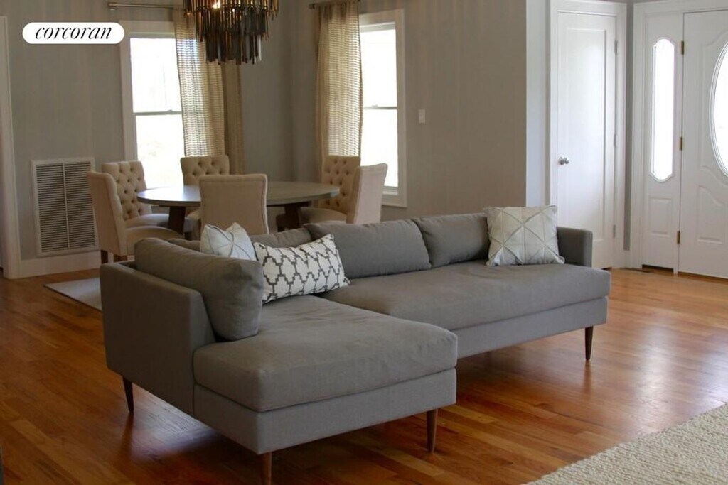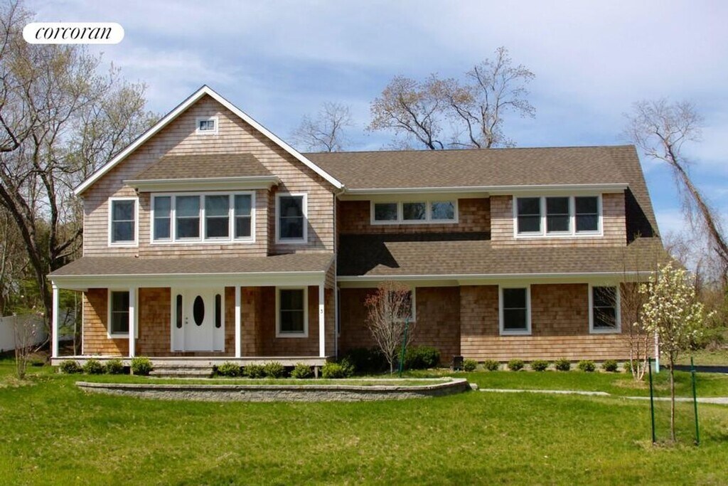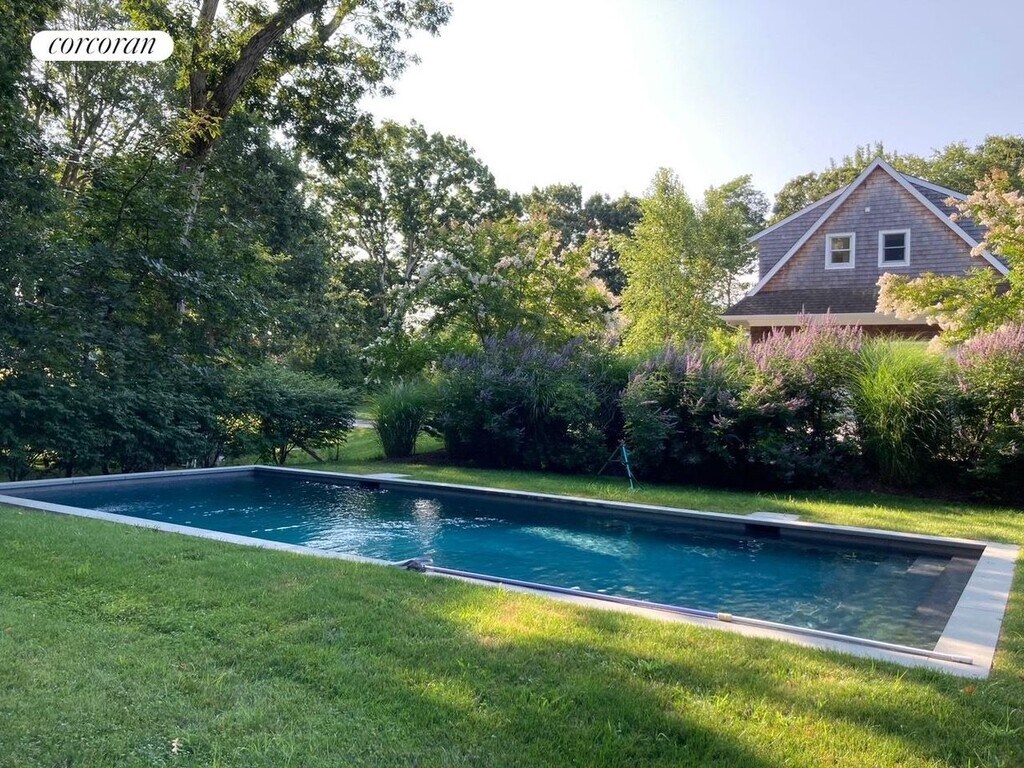 Located near Coecles Harbor, Gardiners Bay Country Club golf course, and several island beaches, this new home on a wooded acre enjoys a spacious open design with vaulted ceilings. Featuring a living room with a stone fireplace, dining area, stylish chef's kitchen with textured granite counters, breakfast bar, stainless appliances, a computer station, and breakfast nook overlooking a spacious backyard deck plus a guest bedroom and bath on the main level. The second floor has a center hall opening to a fabulous master suite with a vaulted ceiling, private marble bath and deck plus two additional bedrooms and bath. The pristine home has a two car garage, all new furnishings, a covered front porch, a new swimming pool, rolling green lawn and flowering trees and plantings. [[Rental Registration # 2024-V-0003]]