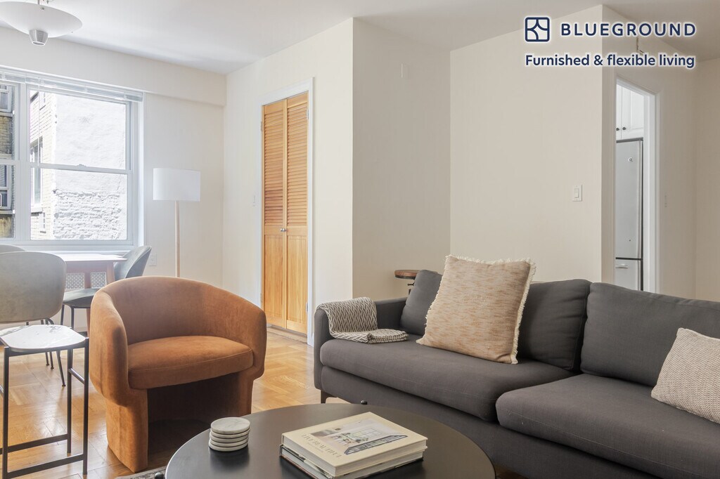 Show up and start living from day one in New York with this lovely two bedroom Blueground apartment. You’ll love coming home to this thoughtfully furnished, beautifully designed, and fully equipped Murray Hill home with stunning views over the city. (ID #NYC1879) The advertised rate of $6,520/month is the lowest available price, based on a 11 month(s) and 22 day(s) stay with a move-in date of January 6, 2026. Rates vary depending on the duration of stay, season, and other parameters. For exact pricing and additional pricing components, please visit our website and enter your desired move-in and move-out dates. The rate is applicable when billed upfront; it can be higher if billed in multiple payments. Brokers are welcome to reach out. Were you looking for an unfurnished lease? Try Blueground instead and upgrade from unfurnished to furnished living: - Furnished at rates comparable to unfurnished - No setup or furniture costs - save thousands - Move-in ready - save time, just bring your suitcase Designed with you in mind Thoughtfully designed with bespoke finishes, modern furnishings, and a fully equipped kitchen, you’ll enjoy that “I’m home” feeling with this Blueground apartment. Whether you’re lounging in your comfortable living room streaming the latest and greatest entertainment on the smart TV or premium wireless speaker, or getting some well-earned rest on the superior quality mattress with luxury linens, you’ll fall in love with everything this Murray Hill apartment has to offer. Sleeping arrangements King Bed, 70.8in/180cm Queen Bed, 63in/160cm Amenities Building amenities unique to this two bedroom apartment include an on-site: - Doorman - Dryer in building - Elevator - Washing machine in building - Lounge - Pets allowed Arrival and ongoing support The entire apartment is yours to enjoy! Throughout your stay, you’ll have access to our Client Experience team through the Blueground App. You can schedule additional cleanings, submit maintenance requests, and view our neighborhood recommendations with just a few taps. We’ll share all details upon confirmation of your stay. Ideally Located This furnished apartment is located in Murray Hill, a lively Midtown neighborhood. The active nightlife scene makes it increasingly ideal for youngsters and recent graduates. Simultaneously, families are relocating here as there are many good schools in close proximity. Murray Hill offers various destinations for culture-lovers. Namely, the New York Public Library and Bryant Park draw residents in from the rest of the city. Grand Central Station is only 5 minutes from Murray Hill by subway. Other things to note Building amenities may have an extra cost. This Blueground apartment has flexible lease options, allowing you to book it for one month, a year, or more. Pets are welcome, though weight limits and breed restrictions apply and may incur fees. Brokes CYOF. We take great pride in ensuring every photo displayed is shot in our own units with our actual furnishings. That said, we regularly refresh our decor and furniture arrangement, which may differ from what’s pictured. [SI]