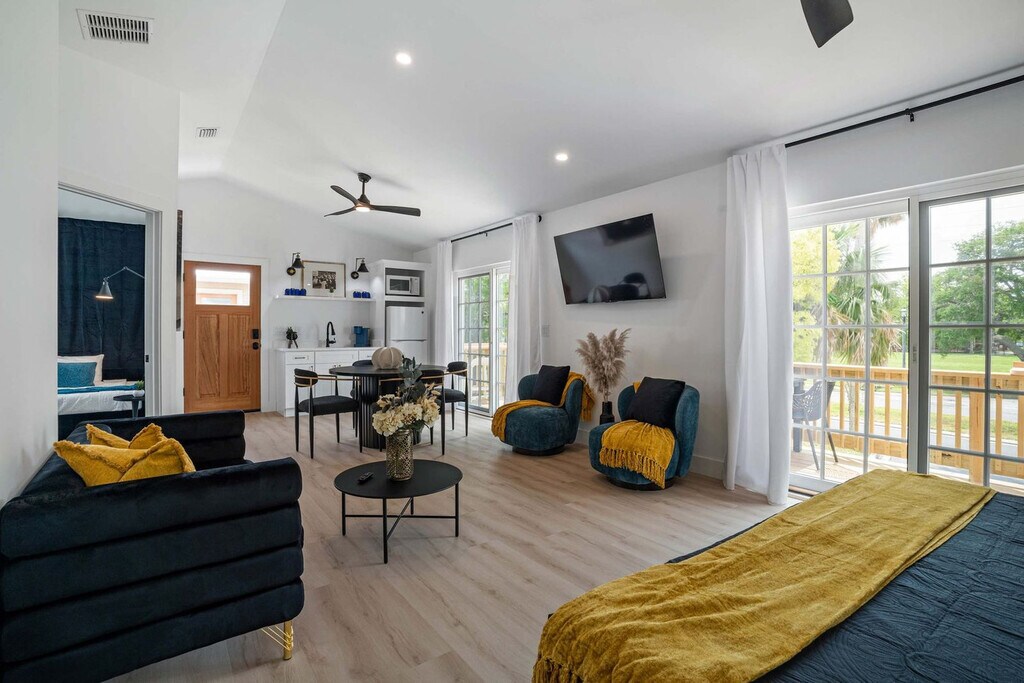 Welcome to this brand new luxury home, perfectly situated just minutes from downtown and directly across from Francis Field. This exquisite residence offers a game room, heated pool, and putt-putt for home entertainment. With two master en-suites, this home is ideal for wedding groups and family reunions. The Grand Augustine is where history and luxury collide, featuring custom craftsman finishes, historic decor, and plush furniture. The main home includes a spacious custom kitchen with luxury finishes, a dining room with vintage charm, and a picture-perfect living room with a smart TV. The first floor hosts a king bedroom with an en-suite bathroom and private pool deck entry, a queen bedroom with an en-suite bathroom, a half bathroom, and a private workspace. The second floor offers a bedroom with two twin beds, a king bedroom, a full bathroom, and an open loft area with a twin daybed and twin trundle. The garage apartment includes a studio with a king bed, a full kitchen, and a small attached bedroom with a full bed and twin trundle. Small events may be approved for an additional fee. An additional security deposit is required for wedding groups and bachelor/bachelorette parties. Located just steps from downtown and directly across from Francis Field, this home provides prime access to all of St. Augustine's top events and attractions. Quiet hours are enforced between 10 PM and 8 AM, with potential city fees for noise violations. The primary guest must be present for the duration of the stay, and any additional guests must be approved by the hosts. The property has actively recording security cameras at the front door and above the garage. No pets are allowed, and smoking or vaping is strictly prohibited, with additional cleaning fees for violations. Late check-outs and early check-ins incur a $100 per hour fee. The home is not child-proofed, and parents with young children use it at their own risk. The home features a private workspace accessible from the front porch, providing a quiet area for work or study.