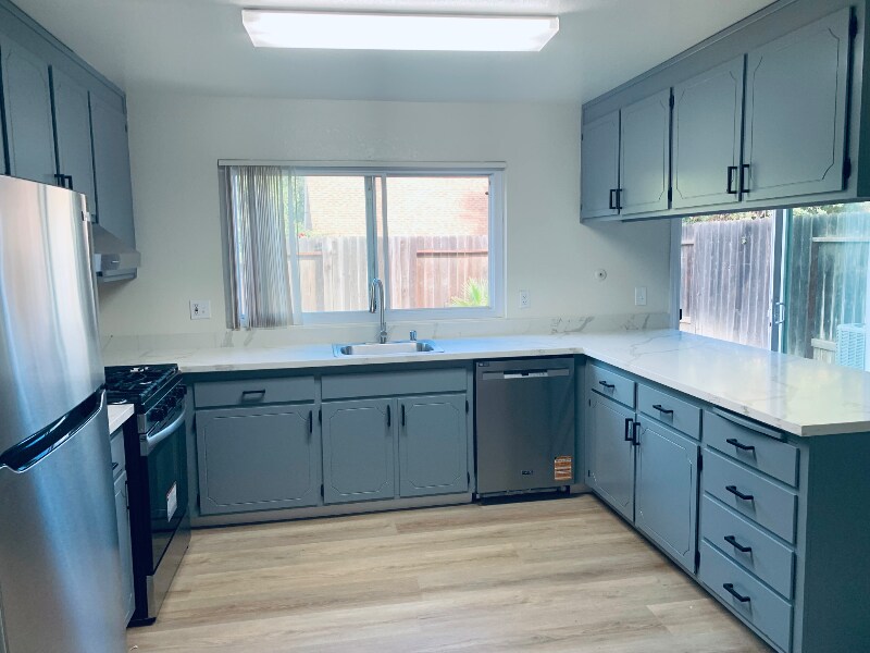 Property Id: 2120754 Highlights: • Fully Remodeled: Fresh interior paint, new luxury vinyl plank (LVP) flooring throughout, freshly painted cabinets and doors with stylish handles, and energy-saving LED lighting in every room. • Energy-Efficient Design: Dual-pane windows and sliding doors.. • Modern Kitchen: Brand-new stainless steel appliances (gas range, range hood, dishwasher, microwave) paired with sleek quartz countertops. • Smart Features: Motion-controlled light switch in the bathroom. • Landscaped and Low-maintenance front and back yards. • In-House Laundry room and hookups. • Remodeled bathrooms with quartz countertops. • Storage & Parking: Detached garage plus an additional storage room. Requirements : · Credit score 650 or greater. · Income of at least 2.5 times rent. · No smoking or vaping. · Small dog (<25 lbs) negotiable with additional pet rent and deposit. · Tenant responsible for utilities. · Renters insurance.