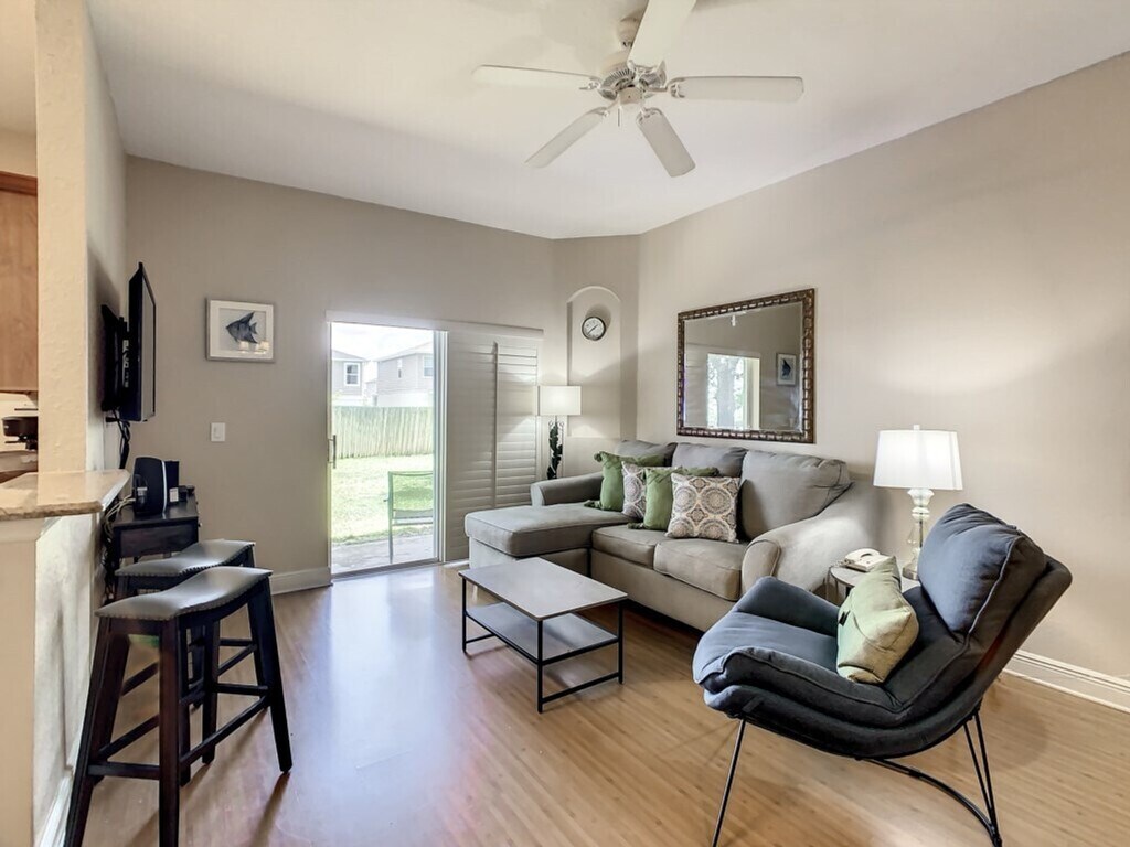 Welcome to Anna’s Regal Escape, a tastefully decorated 3-bedroom, 2-bathroom townhome located within the luxurious Regal Palms Resort & Spa. This 1,425 sq. ft. home features modern amenities, cozy furnishings, and room for 6 guests. Relax at the tropical pool complex, enjoy the lazy river, or unwind in the spa. Just minutes from Disney and Orlando’s top attractions, this is the perfect home for your dream getaway. Step into a warm and inviting living space featuring a cozy sectional sofa, a 4K Ultra HD Smart TV, and access to the backyard. The open layout connects seamlessly to the dining area and kitchen, making it perfect for family gatherings. A fully equipped kitchen awaits with modern appliances, including a refrigerator, oven, microwave, and dishwasher. You'll find all essentials like cookware, dishes, and utensils, plus a coffee maker, toaster, and kettle for added convenience. Relax upstairs in the serene master bedroom with a king-sized bed and ensuite bathroom. The second bedroom features a queen bed, while the third offers two twin beds, perfect for children or extra guests. All bedrooms have TVs and ample storage. Enjoy a private patio with seating for peaceful mornings or unwinding after a day of fun. An in-unit washer and dryer are available for your convenience. Resort fees apply, with access to all incredible resort amenities included. Free parking is available for up to three medium-sized cars, while street parking is prohibited. If you'd like to use the resort's pool towels, a $10 deposit is required per towel, which will be fully refunded when the towels are returned. Located just minutes from Orlando’s top destinations, you can easily visit Disney’s Animal Kingdom, Magic Kingdom, Epcot, and Hollywood Studios within 25–30 minutes. Universal Studios and Volcano Bay are 35–40 minutes away, while SeaWorld and Discovery Cove are just 30–35 minutes from your doorstep. The resort pool is under renovation starting 11/27, with an estimated completion time of 3 weeks. For your safety, security cameras are installed at the front and back entrances, ensuring your privacy as there are no cameras inside the unit. No smoking, parties, or pets are allowed, and any rule violation may incur a $300 fee and potential eviction. Quiet hours are from 9:00 PM to 8:00 AM. By placing a reservation, you give permission for a guest screening process to be conducted by a third-party company to confirm your reservation. [SI]