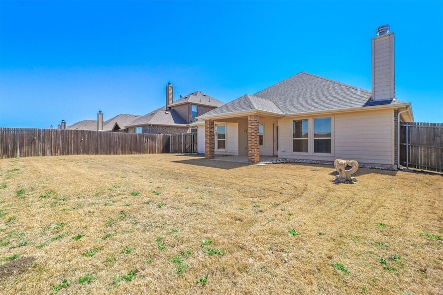 Attractive 3 bedroom home with an office and 3 car garage! High ceilings, open floorplan, huge kitchen open to the breakfast room and living room. Private back porch also included with no neighbors at reara. The Master bedroom is split from other bedrooms and includes double sink vanity, garden tub, and separate shower. Property is on a Cul-de-sac lot and backs up to green space allowing for great privacy. Close to the new Buc-ee's in Royce City.