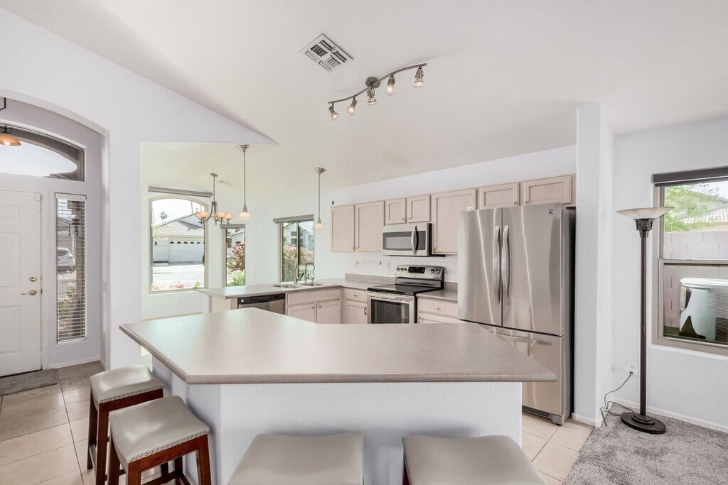 This beautifully updated single-level home in North Phoenix offers the perfect blend of comfort, convenience, and contemporary style. Situated on a private corner lot, it features vaulted ceilings, skylights, and abundant natural light throughout. The open-concept kitchen includes new stainless steel appliances, ample cabinetry, and generous counter space, seamlessly connecting to the living and dining areas for easy flow and entertaining. The spacious primary suite overlooks the backyard and features dual vanities, a soaking tub, separate shower, and a walk-in closet. Enjoy Arizona outdoor living with a saltwater Pebble Tec pool, flagstone patio, built-in BBQ, and low-maintenance turf yard. Recent upgrades include: >>New roof >>Dual-pane energy-efficient windows >>New HVAC system >>Travertine flooring in key areas >>Two-car garage with MyQ Smart App access Located near 32nd Street and Sweetwater Avenue, the home provides convenient access to SR-51, Loop 101, and I-17, with nearby parks, shopping, dining, and recreation. Additional Details: >>Central heating and cooling >>Ceiling fans throughout Tenant pays all utilities and internet (Cox basic is $70/mo and required to run SmartHome systems and apps) Renters insurance required Outdoor maintenance and pool service included. Pets subject to owner approval; no aggressive breeds or cats. Don’t miss your chance to lease this North Phoenix gem—schedule a tour today!