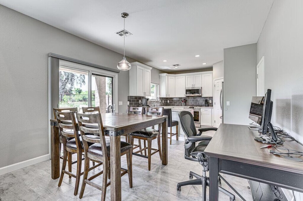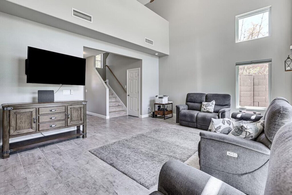 Feel at home in this Phoenix vacation rental, perfect for a memorable desert stay. This 2-story house offers 3-bedrooms and 2.5-bath. One step is required to enter, and interior stairs are required to access the bedrooms on the second floor. This house features smart TVs, a dining table, an en-suite bathroom, a walk-in shower, ceiling fans, a private balcony, a fenced backyard, a putting green, a fire pit table, a covered patio, outdoor dining, a gas grill, and mountain views. The kitchen is equipped with a refrigerator, a Keurig coffee maker (bring your own coffee), a stove/oven, a microwave, a dishwasher, dishware and flatware, and cooking basics. Additional amenities include keyless entry, self check-in, free Wi-Fi, central heating and A/C, and a washer and dryer. Guests have access to the community pool. Garage parking is available for 2 vehicles. Located within the Legacy Golf Resort community, this house offers golf course views and is 5 miles from Arizona Mills. Downtown attractions like Chase Field and the South Mountain Preserve are also within easy reach. Quiet hours are observed from 10:00 PM to 8:00 AM. This property cannot be used for purposes identified in the City of Phoenix Ordinance Section 10-195(c). By booking this property, you agree to comply with City of Phoenix Ordinance G-7156, section 10-204, which requires a sex offender background check and you agree to provide any additional information required to confirm your eligibility to make this booking. Includes an office desk and a printer. [SI]
