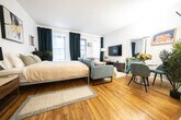 Feel at home in this charming, stylish, and centrally located studio apartment in New York City. This newly renovated and fully furnished apartment offers all necessary amenities, including an elevator, laundry facilities, and a video intercom, making it a great choice for your extended stay. The apartment features a queen-size bed, sofa, desk, mirror, and AC. The kitchen is fully equipped with a large refrigerator, stovetop, oven, coffee maker, toaster, microwave, and all the utensils and cutlery you might need during your stay. A good-sized marble bathroom includes both a shower and a bathtub. A full wall is dedicated to closet space and storage, and laundry facilities are available in the basement. Wi-Fi and all utilities, including heat, hot water, and gas/electricity, are included. Street parking is available for free, but alternate side parking rules apply on most days. Be sure to read all signs to avoid tickets. Located in the Upper East Side, this apartment is just a minute from the Q train line at the 96th Street subway station and five minutes from the 6 train line. The neighborhood is known for its posh buildings, flagship boutiques on Madison Avenue, and proximity to some of the most fantastic museums in the country, including the Metropolitan Museum of Art and the Solomon R. Guggenheim Museum. Parks like Stanley Isaacs Playground and Ruppert Park are also nearby. Smoking inside or outside of the apartment will result in a $500 fine. Pets are not allowed. Luggage storage is not available, so please use a service like to store your luggage before check-in or after check-out. Quiet hours are from 10 pm to 7 am, and the apartment must be used for vacation purposes only, with no commercial use. Check-out time is 11:00 AM, and all dishes should be placed in the kitchen sink, with all trash in the trashcans. Excessive cleaning charges may apply at the owner's discretion. Kindly note that a $350 refundable security deposit is required and will be collected directly by the partner after your booking is confirmed. The security deposit will be handled through direct communication with the partner and is not processed automatically. [SI]