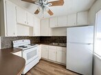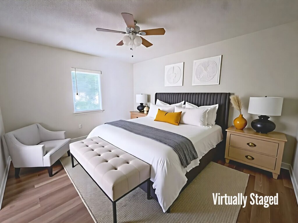 View 360 Virtual Tour: 1 bed 1 bath apartment featuring updated flooring and all white appliances. Enjoy a breakfast bar, a spacious bedroom with walk in closet, and extra storage in the bathroom. Ceiling fans add comfort year-round. Come by our office to check it out today. Disclaimer: The furnishings or enhancements shown are AI-generated and intended for inspiration only. They may not reflect the actual scale, condition, or current features of the property.