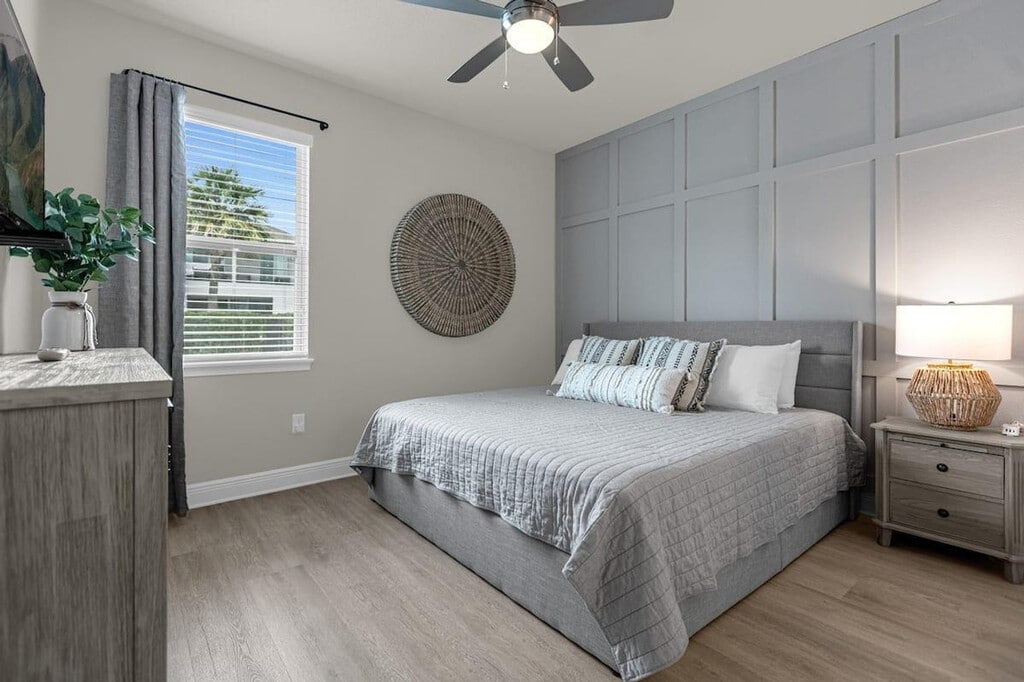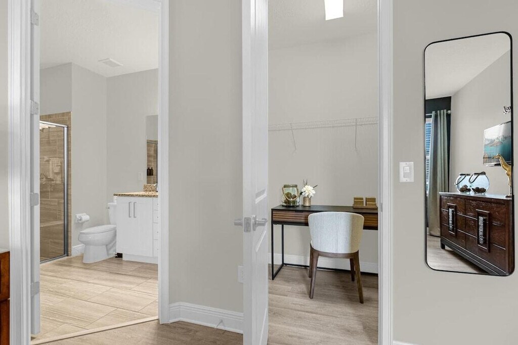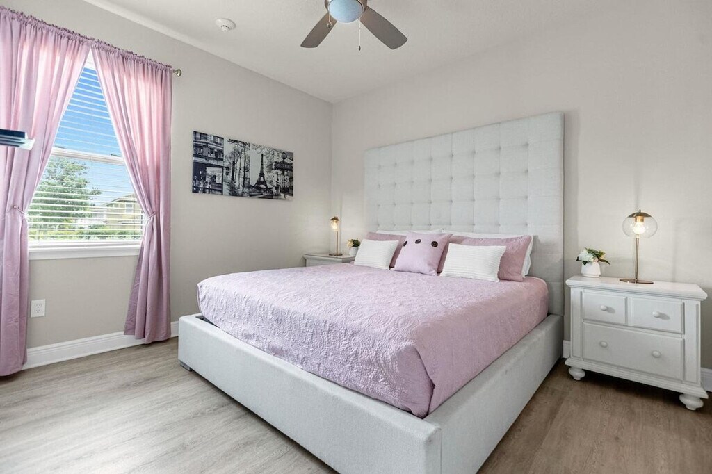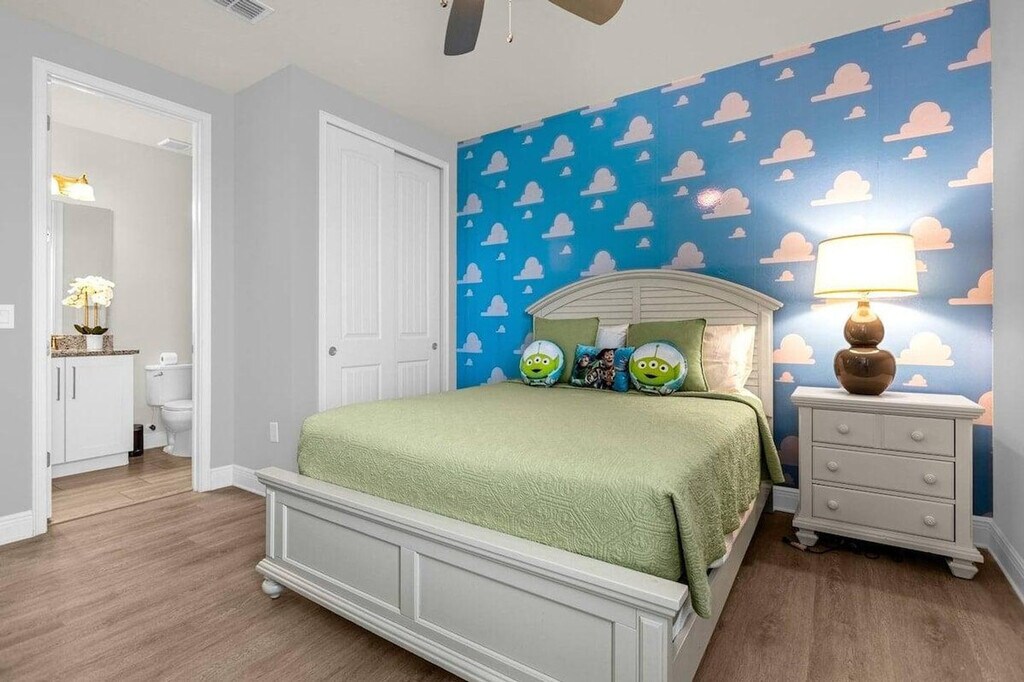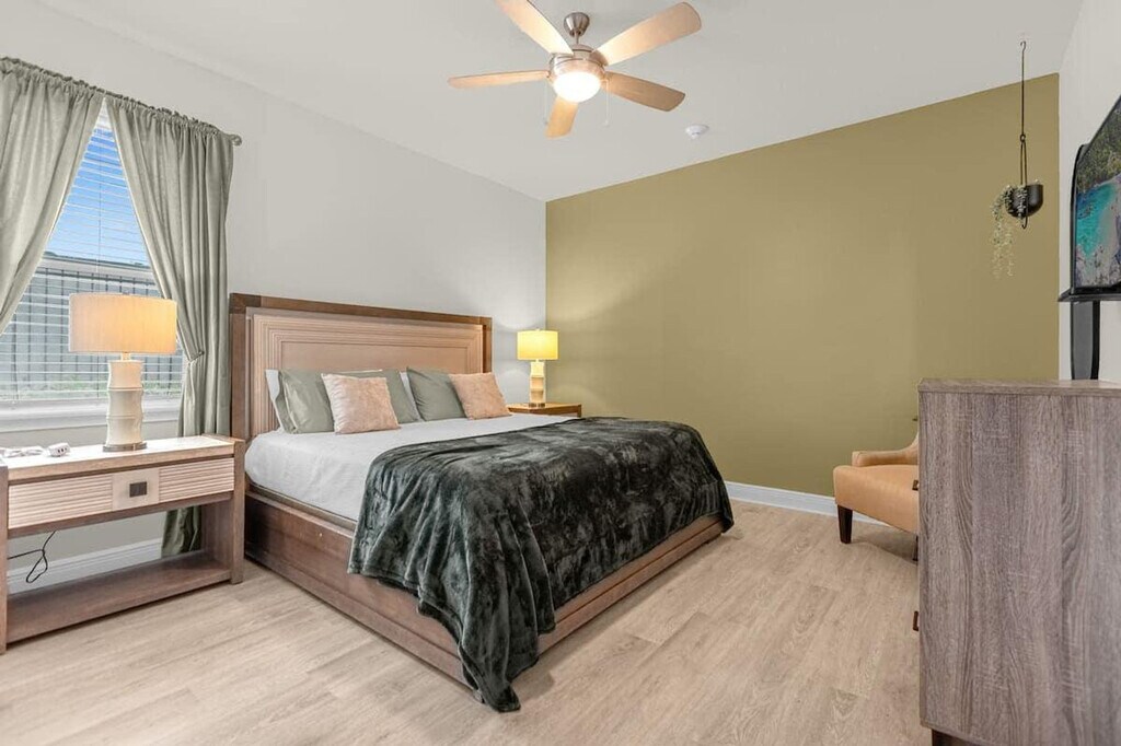 Experience modern luxury in this uniquely redesigned apartment featuring an open floor plan and themed bedroom decor. Situated on the largest lot in the neighborhood, this home offers a balcony view for a relaxing retreat. Each bedroom is equipped with its own full bath, ensuring ultimate privacy and comfort. The apartment also boasts a large pool and hot tub, frequently maintained for an enjoyable experience. The movie theatre is perfect for hosting large groups, while the game room and exercise equipment provide entertainment and fitness options. Additional amenities include a playset and outdoor games, enhancing the outdoor experience for guests and families. Located in a vibrant neighborhood, this apartment offers easy access to local attractions and amenities, making it an ideal choice for both relaxation and exploration. The apartment is designed to provide a peaceful and enjoyable stay, with all facilities maintained to high standards. A dedicated workspace is available, making it convenient for remote work or study sessions. [SI]