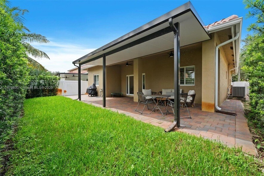 Move-in ready 3/2 in Monarch Lakes with 2-car garage, minutes to I-75. Fresh 2024 tile roof & gutters. Bright open layout kitchen wall removed showcasing a 2020 kitchen with custom cabinets, quartz countertops, and stainless steel KitchenAid appliances. 2020 tile flooring, newer Impact windows (2020), blackout shades in bedrooms, and dimmable lighting throughout. New A/C ductwork plus replaced condenser motor for efficient cooling. Primary bath updated 2023; secondary bath updated 2024. Backyard redone 2024 with new pavers, covered patio roof, and a privacy hedge perfect for easy outdoor living.