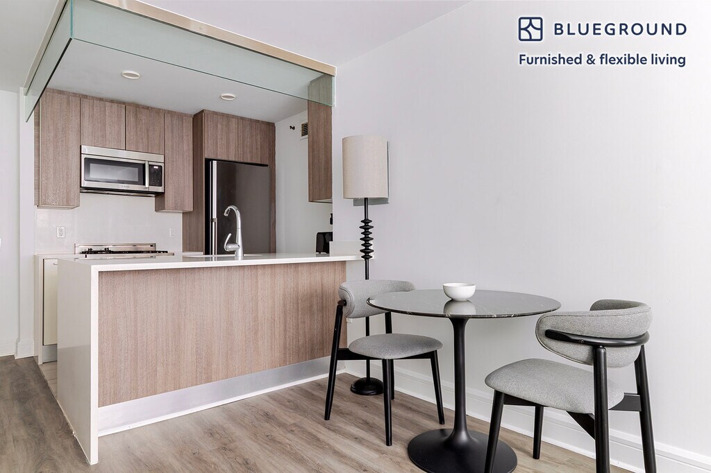 Discover the best of New York, with this studio apartment in Hell's Kitchen. It’ll be easy to simply show up and start living in this furnished apartment with its fully equipped kitchen, living room, and our dedicated, on-the-ground support. (ID #NYC2073) The advertised rate of $3,300/month is the lowest available price, based on a 1 month(s) and 24 day(s) stay with a move-in date of December 13, 2025. If you’re looking for a 1-year stay, the rate is $4,470/month. Rates vary depending on the duration of stay, season, and other parameters. For exact pricing and additional pricing components, please visit our website and enter your desired move-in and move-out dates. The rate is applicable when billed upfront; it can be higher if billed in multiple payments. Brokers are welcome to reach out. Were you looking for an unfurnished lease? Try Blueground instead and upgrade from unfurnished to furnished living: - Furnished at rates comparable to unfurnished - No setup or furniture costs - save thousands - Move-in ready - save time, just bring your suitcase Designed with you in mind Gorgeous furniture, fully equipped kitchen, smart TV, and a premium wireless speaker are just a few of the amenities you’ll find inside this studio apartment. Ideally located in New York, you’ll find a lot to love outside as well. When you’re ready to relax, you’ll be happy to discover every Blueground bedroom comes with superior quality mattresses, luxury linens, and cozy towels. We handle everything so you can simply show up and start living. This apartment also offers in-apartment laundry. Sleeping arrangements Queen Bed, 63in/160cm Amenities Building amenities unique to this studio apartment include an on-site: - Doorman - Dryer - Elevator - Washing machine - Lounge - Pets allowed Arrival and ongoing support The entire apartment is yours to enjoy! Throughout your stay, you’ll have access to our Client Experience team through the Blueground App. You can schedule additional cleanings, submit maintenance requests, and view our neighborhood recommendations with just a few taps. We’ll share all details upon confirmation of your stay. Other things to note Building amenities may have an extra cost. This Blueground apartment has flexible lease options, allowing you to book it for one month, a year, or more. Pets are welcome, though weight limits and breed restrictions apply and may incur fees. Brokes CYOF. We take great pride in ensuring every photo displayed is shot in our own units with our actual furnishings. That said, we regularly refresh our decor and furniture arrangement, which may differ from what’s pictured.