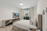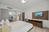 Welcome to this modern studio unit at Costa Hollywood Beach Resort, perfect for couples or solo travelers. Featuring a plush king-size bed, high-speed Wi-Fi, and a convenient kitchenette, this apartment offers comfort and functionality. Located just steps from the beach and boardwalk, you'll feel at home in this vibrant setting. This 365 sq. ft. modern Ocean View unit with a Courtyard View is designed for your comfort. The plush king-size bed ensures a restful night's sleep, while the small kitchenette caters to your light meal prep needs. High-speed Wi-Fi makes it ideal for remote work, and the open layout maximizes space for a cozy stay. Additional fees apply at check-in, including a mandatory administrative fee of $56.50 per stay and a resort fee of $45.20 per night. Optional valet parking is available at $44.94 per night for regular vehicles and $84.00 for large vehicles. A pet fee of $100 per stay applies. Resort amenities include a rooftop pool with ocean views, fitness center access, complimentary beach chairs, pool and beach towels, yoga classes, and a free 1-hour bicycle rental for up to 2 bikes. Situated just steps from the beautiful Hollywood Beach, the neighborhood around the famous Hollywood Broadwalk offers a lively coastal atmosphere. With 2.5 miles of beachfront, the Broadwalk is lined with charming cafes, unique shops, and outdoor dining options. Enjoy walking, biking, or rollerblading along the Broadwalk, with rental shops nearby. The pristine beach is perfect for swimming, sunbathing, and water sports, while family-friendly parks and playgrounds are just a short walk away. Evenings come alive with live music and entertainment, making it a great destination for a fun and relaxing stay by the beach. This privately owned unit does not offer hotel services such as housekeeping or room service. Shared laundry rooms are available at $2.50 per load. A noise monitoring system is in place to ensure neighborhood noise levels are respected, with no cameras inside. A vacation rental agreement is required before check-in.