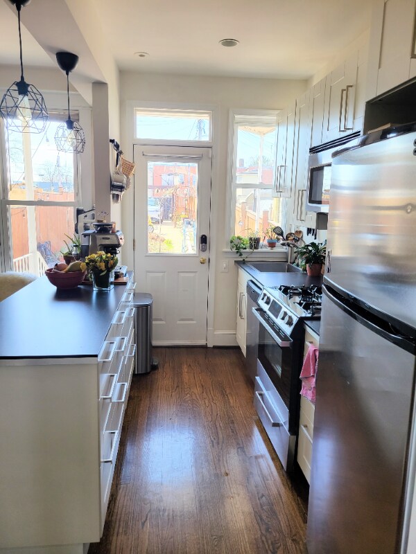 Property Id: 1143598 Spacious renovated light-filled end unit row house with open floor plan, large lot, fenced backyard and long drive-way. Hardwood floors. Stainless steel kitchen appliances. Flagstone porch. Skylight. Finished basement w/ kitchenette. Solar panels save ~$60/mo on electric bill. Smart home w/ smart lights, Nest thermostat, locks, doorbell camera, smart washer/dryer. Short walk to Children's Hospital, Washington Hospital Center,Doubles, No Kisses, Sonnys, St Vincent, Heat Da Spot, Call Your Mother, Midlands, Aurora Market, Lamont Market. Large backyard for entertaining, fenced off-street parking for up to 3 cars and finished basement. Small dogs allowed with $500 pet deposit. Other pets considered on case-by-case basis. Additional features: Sunset Views. Convenient location. 15 mins walk to Petworth or Columbia Heights Metro. Walk Score 91/100. Protected bike lanes. Sunny Windows. Tall Ceilings. Electric Level 2 car charger in parking area. Pergola. Native pollinator garden.