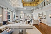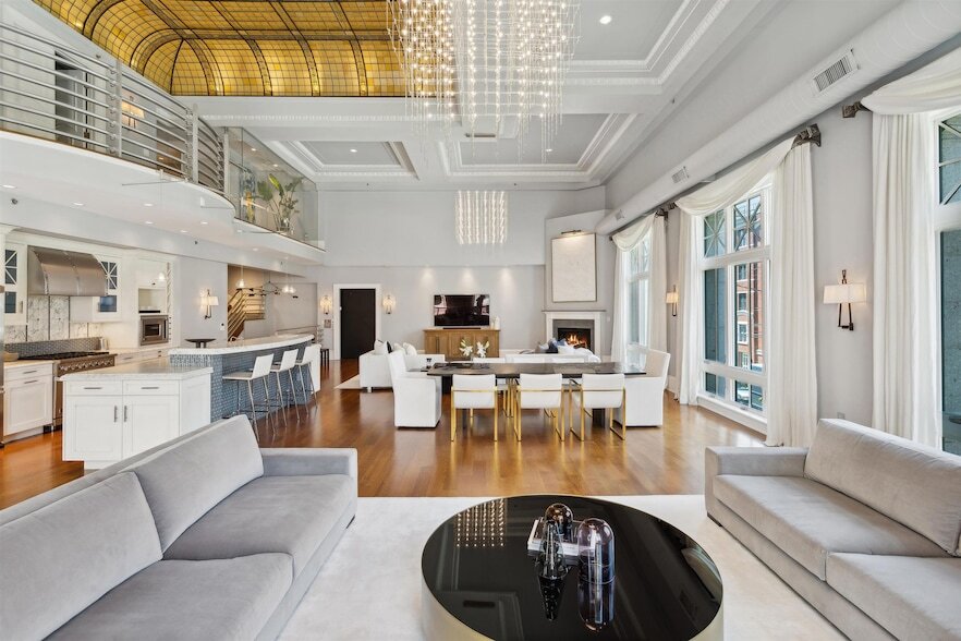 Stunning, one-of-a-kind corner loft at the Historic Jefferson Trust Bank building. Built in 1909 and placed on the National Register of Historic Places in 1986, this truly unique space has soaring 21 foot ceilings, 3180 SF of living space, 2 bedrooms plus den, 2.5 bathrooms, private keyed elevator access into the home and garage parking for one car. Designed for entertaining, the five 9.5 foot high windows with northern and western exposures saturate the great room with natural light. The original egg and dart plaster moldings and spectacular 400 square foot stained glass backlit skylight are significant examples of the historic architecture of the building and compliment the loft's scale and opulence. Open chef s kitchen features Viking appliances, Carrara marble countertops and large island with breakfast bar. Both bedrooms have en suite bathrooms complimented by duel sinks, soaking tubs and showers. Second floor den provides the perfect home office or nursery. Half bath, laundry room, dark stained wide-plank solid oak hardwood floors, motorized window treatments, smart-lighting system, fire place and duel HVAC system round out this incredible home. Garage parking plus proximity to PATH, ferry, light rail and busses make commuting a breeze. Completely furnished including towels & linens, plates & glasses, pots & pans, cable/wifi & electric.