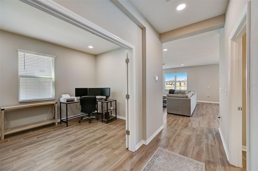 Beautiful 4-bedroom, 3-bathroom, 3-car garage home in the desirable Berry Bay community featuring over 2,600 sq ft, serene water views, and modern upgrades throughout. The open-concept layout offers wood-look tile flooring on the main level, a spacious gourmet kitchen with granite countertops, stainless steel appliances, walk-in pantry, and large island, plus a bright living area overlooking the pond. A first-floor bedroom and full bath provide flexibility for guests or a home office. Upstairs includes a generous primary suite with dual vanities and walk-in closet, two additional bedrooms, and a versatile loft. Enjoy outdoor living on the covered patio with water views, along with epoxy garage floors and EV charging outlet. Community amenities include a pool, clubhouse, sports courts, and playground.Lease-to-own options may be considered for qualified applicants.
