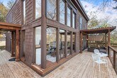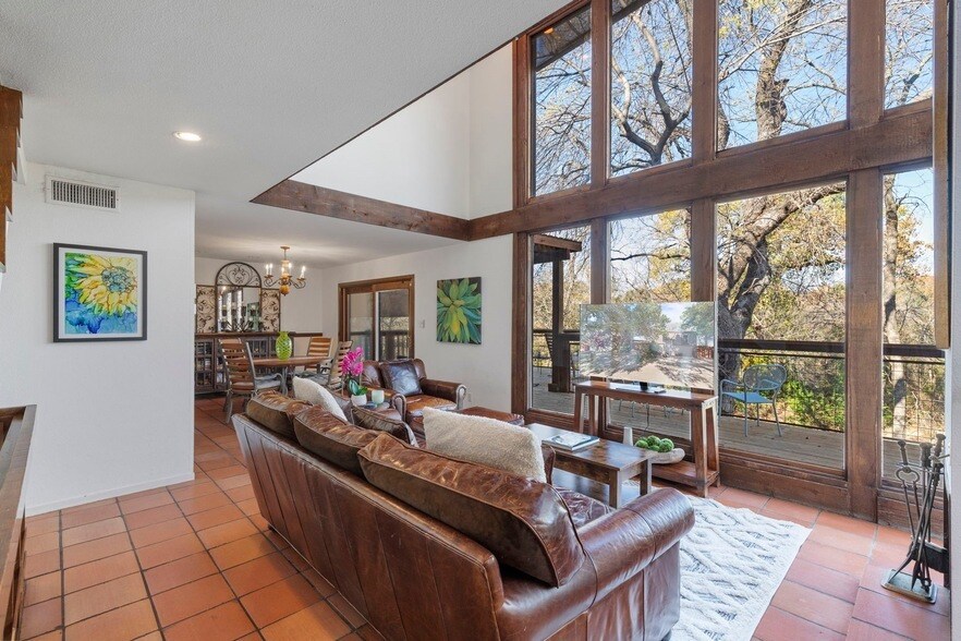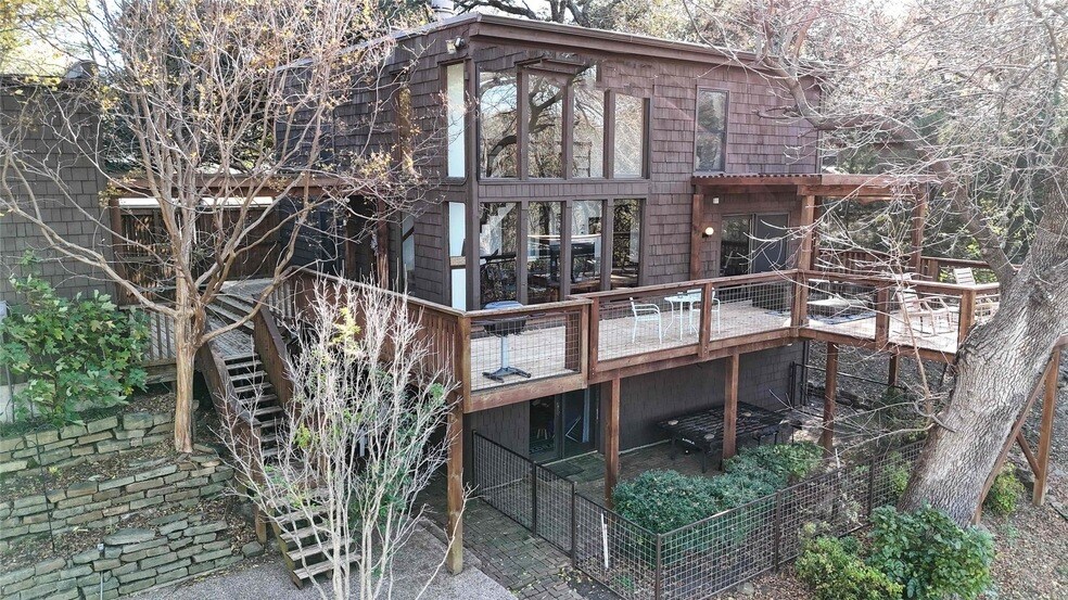 This very unique and special home sits on almost a half-acre cul-de-sac lot in Farmers Branch overlooking the serene Farmers Branch Creek, offering the feeling of a private mountain lodge surrounded by mature trees and peaceful water views. The unassuming curb appeal transforms the moment you enter through the gated entry, where the main level unfolds across an expansive deck. To the left is the inviting entrance to the home, and to the right is the detached two-car garage with additional space for motorcycles, toys, and storage. Inside, the main level features a warm family room with a fireplace and a dramatic floor-to-ceiling wall of windows framing the impressive backyard and creek. One of the primary bedrooms with its ensuite bath is conveniently located on this level. The second floor includes a second primary bedroom, a guest bedroom, and a flex room that can serve as an additional bedroom or office, as well as a loft that delivers incredible panoramic views of the lot and creek an inspiring spot for work, relaxation, or reading. The lower level offers a large gameroom and an additional bedroom, ideal for guests or multigenerational living. The expansive wood deck provides outstanding space for entertaining while taking in the spectacular views. The generous half-acre lot gently slopes toward the creek and boasts mature trees, and plenty of grassy area for play. The detached garage also includes a second-level storage space and has the potential to be reconfigured for car enthusiasts, with high ceilings that can easily accommodate car lifts for four or more vehicles. This one-of-a-kind property is moments from 635 and 35 yet feels worlds away, offering the rare blend of convenience and a true escape to nature. Please email Chris Scott for the Application Link.