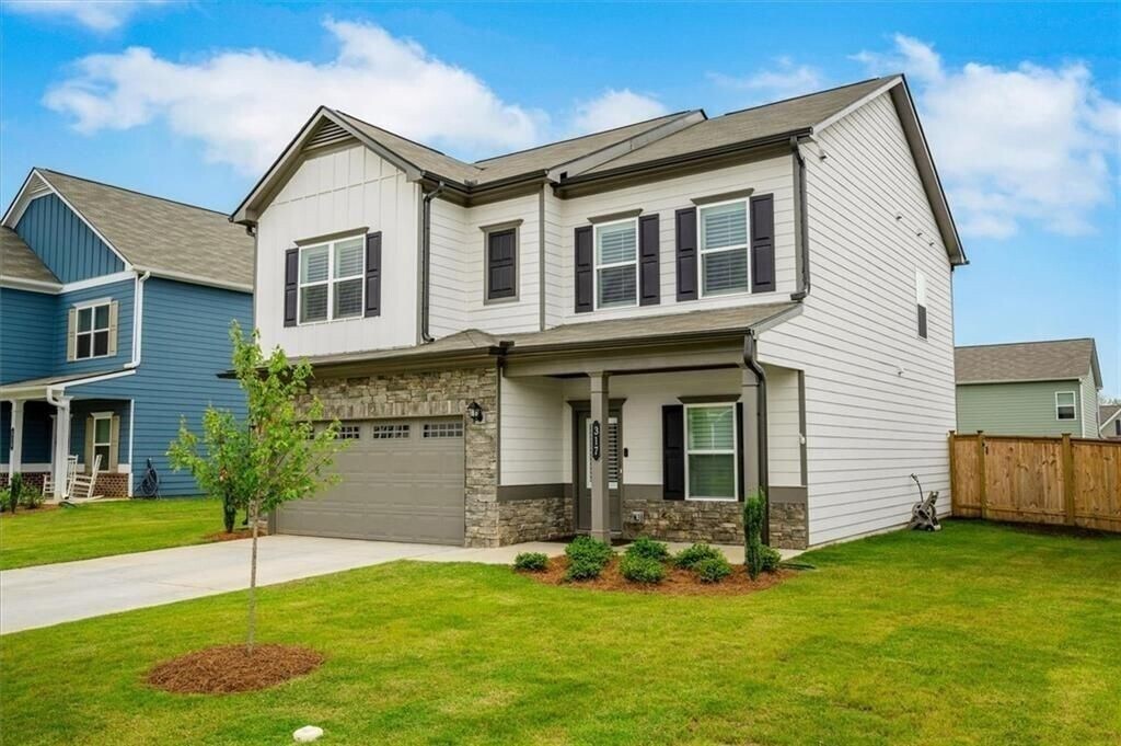Move right into this beautiful one-year-old, 4-bedroom home in the desirable Duncan Farm community! Featuring 2.5 bathrooms, 2,053 sq ft, and a fully fenced backyard, this home is perfect for comfortable modern living. Step into a bright foyer with 9-foot ceilings and luxury vinyl plank flooring that flows through the main level. The open floor plan offers a versatile flex space—ideal for a home office—plus a spacious kitchen with granite countertops, large island, walk-in pantry, and stainless-steel appliances. The living area is roomy and welcoming, perfect for relaxing or hosting guests. Upstairs, enjoy a spacious primary suite with a walk-in closet, double vanity, soaking tub, and separate shower. Three additional bedrooms, a full bath, and a convenient upstairs laundry room provide plenty of space for everyone. Relax outdoors on the back porch or enjoy the large, level fenced yard. Located directly across from Hamilton Crossing Park and minutes from shopping, dining, and major highways, this home offers the perfect mix of comfort and convenience.