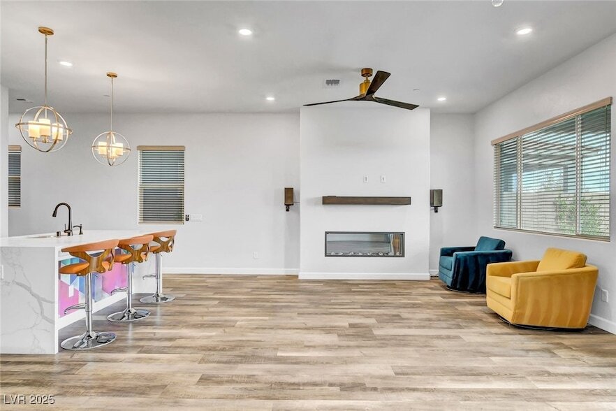 Modern four bedroom in the heart of Summerlin with stunning strip views. This unique property boasts LVP flooring throughout the downstairs. Upgraded kitchen features stunning quartz countertops with a waterfall edge, large island with seating, modern pendant lights, and a large pantry. Incredible strip views from the living room and backyard. Custom electric fireplace and mantle in the living room. Upstairs features four oversized bedrooms plus a loft. Incredible primary with a balcony and more views. Ensuite bathroom features his and hers sinks, large-shower, and a soaking tub. Low maintenance yard with lots of turf. Summerlin location near lots of walking and hiking trails, high-end shopping, and highly rated restaurants. This incredible home will not last long. Tenant places electric, water, trash, and gas in their name.