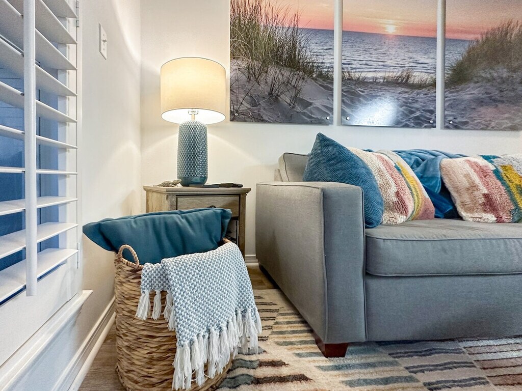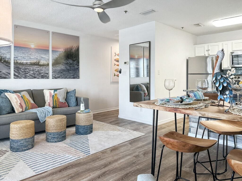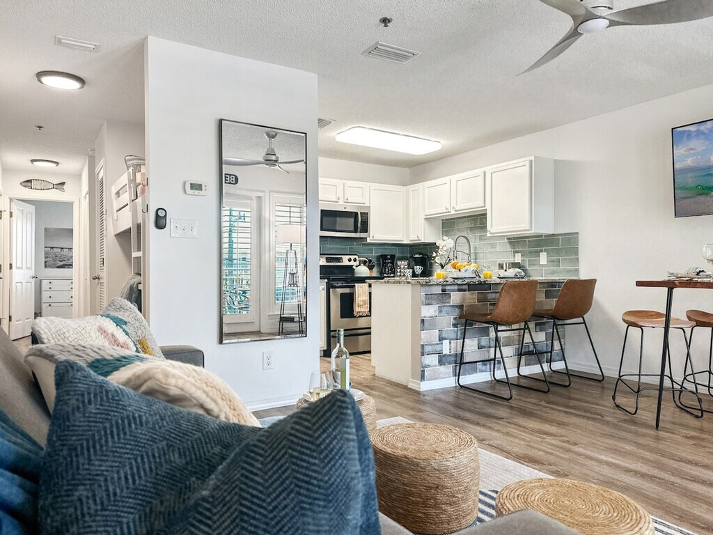 "Sunrise Destin-ation" is the perfect spot for your next Destin getaway! Located on the third floor, this condo offers a king bedroom, a twin-bunk alcove, and a queen sleeper sofa, accommodating up to six guests. Enjoy the community pool just steps from two gorgeous public beach access points directly across the street. This freshly remodeled condo features an open floor plan living area with a cozy living room, a dining area that seats four, and a kitchen island with two additional seats. The fully stocked kitchen includes a suite of appliances, a microwave, dishes, cutlery, pots and pans, a crock pot, blender, toaster, and griddle. Coffee enthusiasts can choose between a drip coffee maker with a reusable filter or a Keurig machine. The washer and dryer are conveniently located in the hallway at the entryway. The community offers a seasonally heated and gated pool, a community charcoal grill with a picnic area available year-round, and a spacious L-shaped balcony for enjoying Florida sunrises and sunsets. A pack and play, high chair, and children's dining ware are available free of charge. Nestled in the desirable Crystal Beach neighborhood within the Grand Caribbean community, this condo is just a 3-minute walk to a gorgeous public beach access. Enjoy the proximity to wonderful shopping, amazing restaurants, and plenty of public beach access. Explore local favorites like AJ’s Seafood & Oyster Bar, Camille’s for Crystal Beach Coffee, and The Donut Hole for delicious treats. This is a third-floor condo with no elevator access, making it unsuitable for guests with mobility issues. Check-in is after 4 pm, and checkout is at 10 am. No additional guests are permitted beyond the number booked. The property enforces a no-smoking policy, with a full security deposit enforced for odor removal. Trailer, RV, BoxTruck, and Watercraft parking is not permitted, with towing fees applicable for violations. Excessive noise, parties, illegal activity, or disturbances are not allowed, and noise ordinances are in effect at 10 pm sharp. A remote work-friendly environment is provided with a 55" Smart TV for entertainment after a long day. [SI]