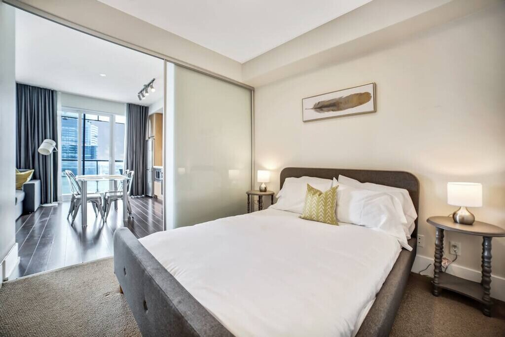 Discover the best of Toronto with this clean and modern 1-bedroom apartment located on a lower floor at 300 Front. Feel at home with a fully equipped kitchen, in-unit laundry, and a balcony to enjoy the city views. The apartment features a 50" Smart TV with an HD VIP cable package and high-speed 500 Mbps internet, ensuring entertainment and connectivity at your fingertips. The separate bedroom includes a queen bed and a walk-in closet, providing ample space and comfort. Located in a prime area, all amenities are at your doorstep, including a Starbucks and South Street Burger within the condo premises, offering convenience and a taste of the local lifestyle. The apartment is professionally managed by a trusted partner and requires a minimum stay of 30 nights. The apartment includes a desk with a chair, making it a suitable space for remote work or study. [SI]