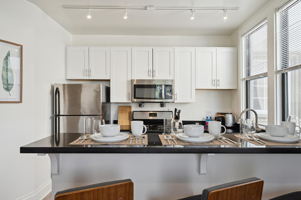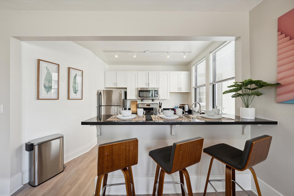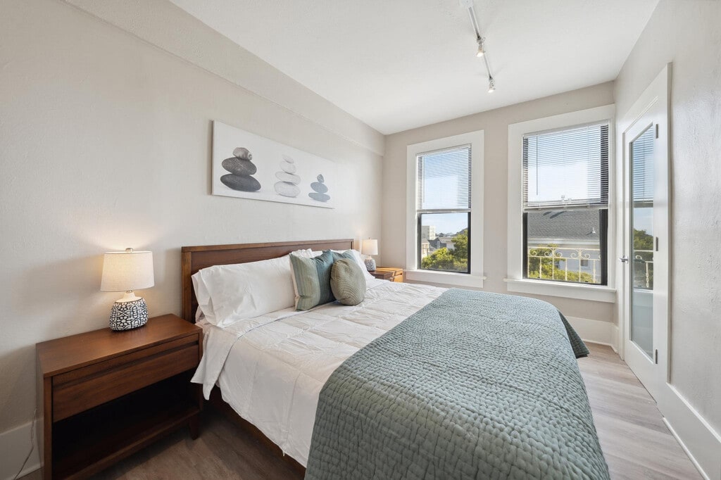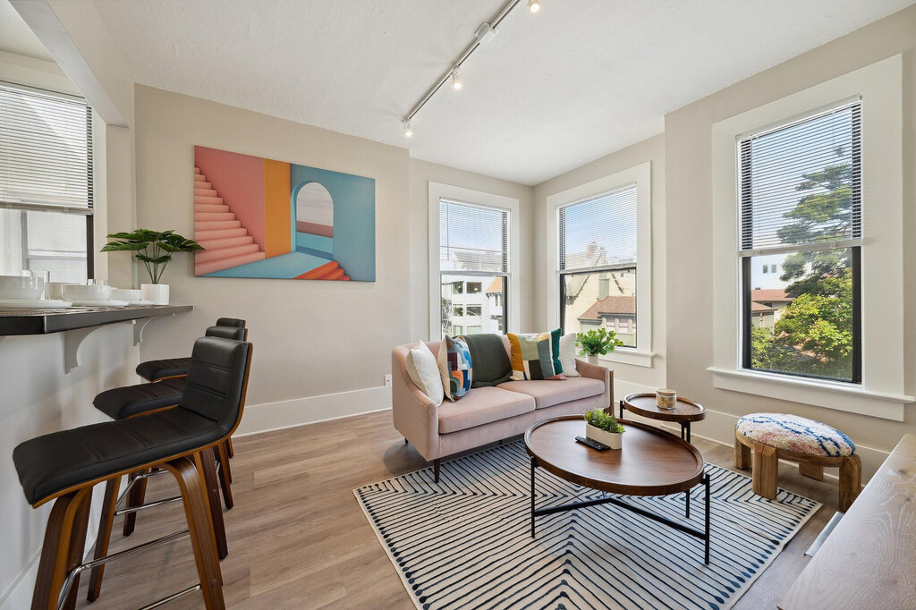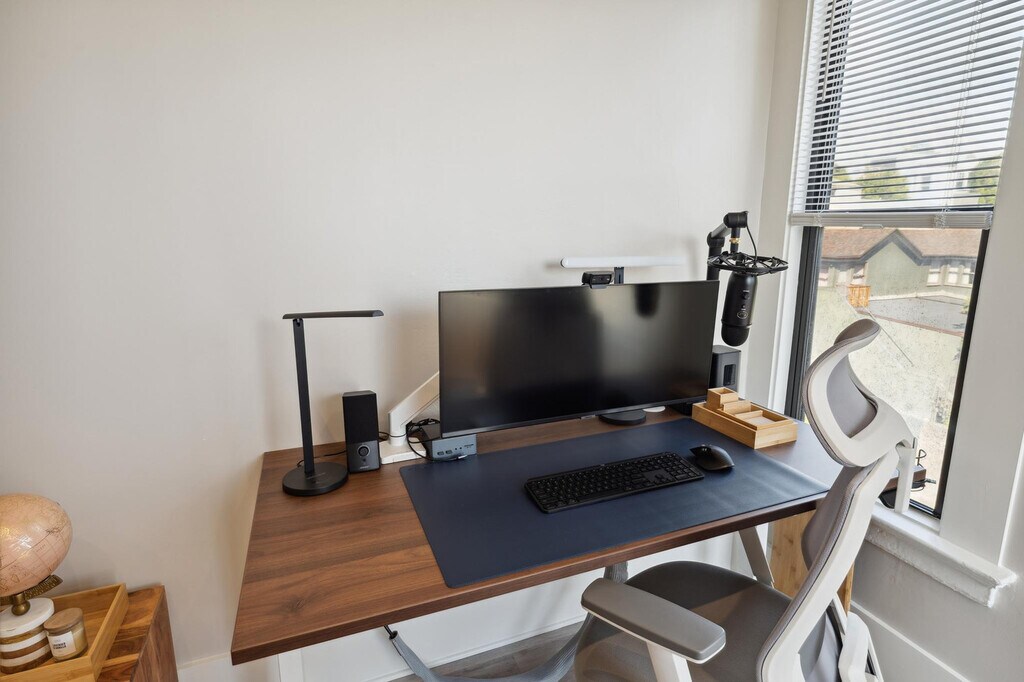 Experience the charm of San Francisco's most exclusive neighborhood in this historic building, perfect for those who work from home. With a Walk Score of 95, this apartment is just steps away from Presidio Park, offering easy access to a variety of highly-rated restaurants, cafes, and shops, as well as stunning panoramic views of the city's renowned landmarks and San Francisco Bay. Please note, this building does not have an elevator and access is via staircase only. This fully furnished 1-bedroom apartment is custom designed for the remote worker seeking an inspiring environment. It includes a fully equipped kitchen, a full bathroom, a king-size mattress plus a second trundle bed, a smart TV, and all utilities. The apartment features stainless steel appliances, granite countertops, a stocked kitchen with a dishwasher, hardwood flooring, a Keurig coffeemaker with pods, a walk-in closet, and onsite laundry. Street parking is available, though there is no air conditioning in this unit. Early check-in from 10am-3pm will incur a fee of $75, and early check-in before 10am will incur a fee of one full night's rent. Late check-in after 9pm will incur a fee of $75. Late check-out from 11am-3pm will incur a fee of $75, and late check-out after 3pm will incur a fee of one full night's rent. Late check-outs must be requested at least 48 hours in advance. Located in a prime area with a Walk Score of 95, this apartment is just steps from Presidio Park. You'll find everything you need right at your fingertips, including a variety of highly-rated restaurants, cafes, and shops, along with stunning panoramic views of San Francisco's renowned landmarks and the Bay. This extra spacious unit includes a separate home office with sleeping space for two more guests. Internet speeds are not guaranteed and may fluctuate based on your computer model and the router location. Includes private high-speed internet, a standing desk, an ergonomic work chair, a 34-inch ultra-wide monitor, a microphone, a webcam, computer speakers, an LED streaming light, a green screen, a keyboard, a mouse, a laptop stand, and a TOTU 16-in-1 Triple Display USB-C 3.1 Docking Station. A laptop computer is not included. [SI]