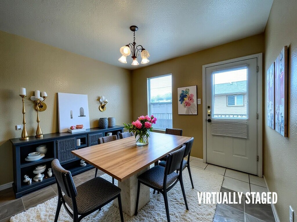 View 360 Virtual Tour: Apartment D is an upstairs units. Bedrooms and living area are carpeted, and the kitchen, dining area, and bathrooms have linoleum. The kitchen comes complete with a fridge, oven, dishwasher, garbage disposal, and pantry. Off the kitchen you will find a breakfast area with access to the outside patio. Primary bedroom has a private bathroom. Secondary bedrooms share a hallway bath. Unit has washer/dryer hookups. This property accepts HUD/ Section 8. Disclaimer: The furnishings or enhancements shown are AI-generated and intended for inspiration only. They may not reflect the actual scale, condition, or current features of the property.