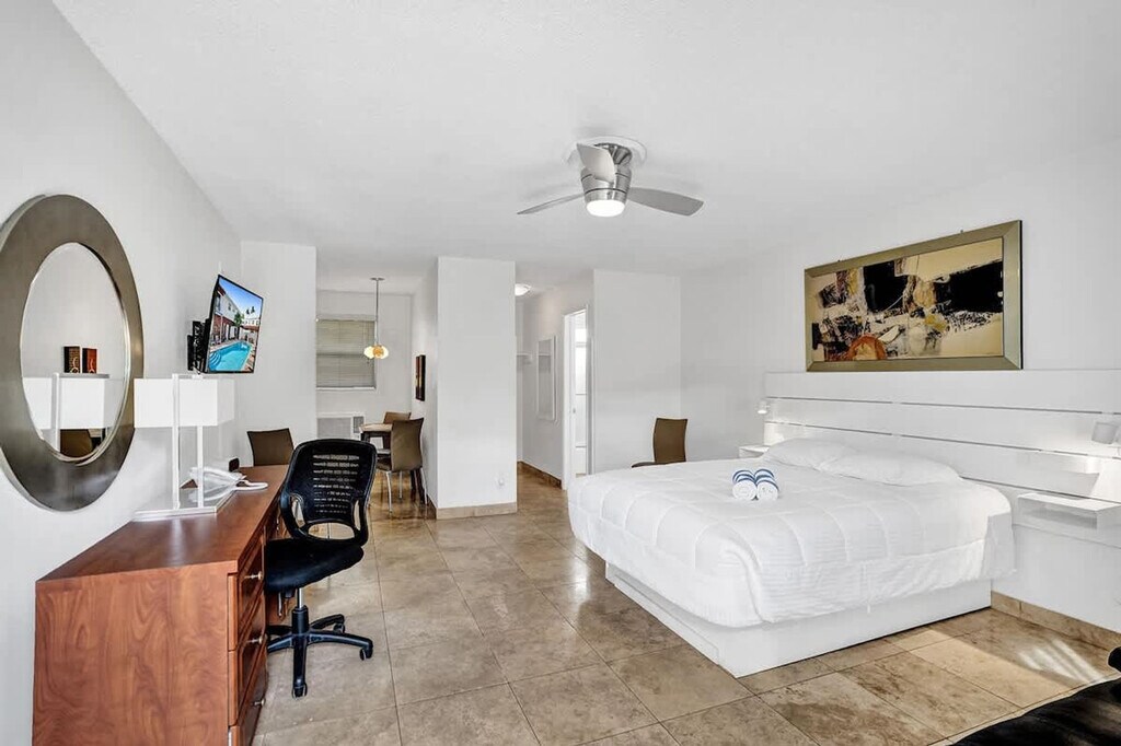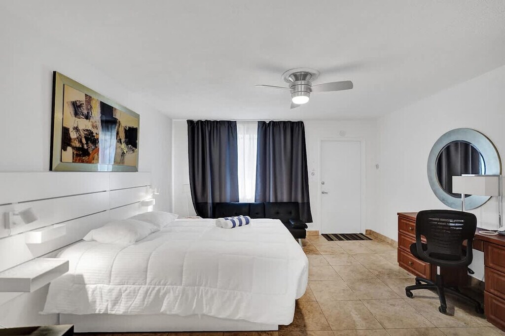 The advertised rate of $3,696/month is the lowest available price, based on a 30 day(s) stay with a move-in date of December 31, 2028. Rates vary depending on the duration of stay, season, and other parameters. For exact pricing and additional pricing components, please visit our website and enter your desired move-in and move-out dates. The rate is applicable when billed upfront; it can be higher if billed in multiple payments. Welcome to Waves, a 20-unit complex in the heart of Pompano Beach, Florida, where you can feel at home in this studio apartment. This apartment has a spacious living area. This peaceful beachside retreat offers fast Wi-Fi and a Smart TV with streaming capabilities. The kitchen is fully equipped. Guests have access to the shared BBQ grill area and outdoor seating areas throughout the property. Pets are welcome for an additional fee. Additional cleanings during your stay can be scheduled for an added cost. One free on-site parking spot is included per reservation. Additional supplies of toiletries and consumables can be provided for an extra fee. This apartment is within walking distance of the beach and ample restaurants, nightlife, and attractions. It is about 30 minutes from Fort Lauderdale-Hollywood International Airport. Nearby attractions include Pompano Beach, the Pompano Beach Fisher Family Pier, the Sample-McDougald House, and Hillsboro Inlet Lighthouse. Local dining favorites include Beach House, Oceanic, Lucky Fish, Houston’s, and Cyth & Co. Shops and essentials can be found at Publix Supermarket, Pompano Citi Centre Mall, and boutique beach shops and surf stores along A1A. Occupancy limits are strictly enforced per city ordinance, and full legal names of guests must be provided upon booking. Only standard-size personal vehicles are permitted, and no trailers, boats, vessels, recreational vehicles, buses, box trucks, oversize, or commercial vehicles are allowed, with a $500 fine for violation. Any guest found to be having a party will be required to leave immediately without a refund, and will incur a $500 fine for violation. Quiet hours are from 10 PM to 9 AM, and any noise complaint will result in a $500 fine. No indoor smoking is permitted; outdoor smoking at least 10 feet from the building is permitted, and all windows/doors to the unit must remain closed while smoking outdoors, with a $500 fine for violation. To help ensure the safety of guests, the property is monitored with exterior cameras that capture and record audio and video; unplugging, moving, or any alteration of the security cameras or any of its cords, base station, or any other parts/apparatus will result in a $1000 fine. Any guest who would like to have packages delivered must first obtain permission. Once the stay has been completed, guests must refrain from leaving luggage or personal belongings upon checkout. Includes a desk workspace. Please note that the partner will place a $350 refundable authorization hold on a credit or debit card about 72 hours before arrival for security. If damages or policy violations occur, related charges may apply; otherwise, the hold is released after checkout and processed within 5-7 business days. [SI]