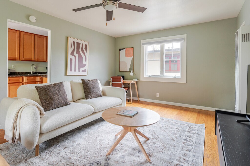 Similar space, but different These photos are of a similar space and style to this apartment. They’re intended to give you a sense of Blueground’s design style. Exact furniture and layout will be different. Be the first to rent! Discover the best of Palo Alto, with this one bedroom apartment in Downtown North. It’ll be easy to simply show up and start living in this furnished apartment with its fully equipped kitchen, living room, and our dedicated, on-the-ground support. (ID #SFO2114) The advertised rate of $3,850/month is the lowest available price, based on a 11 month(s) and 21 day(s) stay with a move-in date of December 28, 2026. Rates vary depending on the duration of stay, season, and other parameters. For exact pricing and additional pricing components, please visit our website and enter your desired move-in and move-out dates. The rate is applicable when billed upfront; it can be higher if billed in multiple payments. Brokers are welcome to reach out. Were you looking for an unfurnished lease? Try Blueground instead and upgrade from unfurnished to furnished living: - Furnished at rates comparable to unfurnished - No setup or furniture costs - save thousands - Move-in ready - save time, just bring your suitcase Designed with you in mind Gorgeous furniture, fully equipped kitchen, smart TV, and a premium wireless speaker are just a few of the amenities you’ll find inside this one bedroom apartment. Ideally located in Palo Alto, you’ll find a lot to love outside as well. When you’re ready to relax, you’ll be happy to discover every Blueground bedroom comes with superior quality mattresses, luxury linens, and cozy towels. We handle everything so you can simply show up and start living. This apartment also offers in-apartment laundry. Amenities Building amenities unique to this one bedroom apartment include an on-site: - Dryer - Washing machine - Parking - Pets allowed Arrival and ongoing support The entire apartment is yours to enjoy! Throughout your stay, you’ll have access to our Client Experience team through the Blueground App. You can schedule additional cleanings, submit maintenance requests, and view our neighborhood recommendations with just a few taps. We’ll share all details upon confirmation of your stay. Other things to note Photos are from a similar property. This Blueground apartment has flexible lease options, allowing you to book it for one month, a year, or more. Pets are welcome, though weight limits and breed restrictions apply and may incur fees. Parking is offered based on availability and is subject to a fee. Please keep in mind that this is a walk up building. [SI]