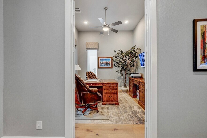 Experience exceptional craftsmanship in this beautifully designed one-story brick home where no detail was overlooked. Step inside to find soaring ceilings, elegant 7" European White Oak flooring throughout, plush upgraded carpet in select areas, striking custom lighting and custom window treatments. The private study is framed by double doors, while the gourmet kitchen showcases an oversized sink, gas cooktop, and thoughtfully designed layout. Utility room showcases quartz countertops in addition to a sink and storage cabinets. A wall of windows floods the living spaces with natural light and offers views of the backyard oasis, complete with an outdoor kitchen, built-in firepit, ceiling fan, and expansive lush green lawn perfect for relaxation and entertaining. The luxurious primary bath is a true retreat, featuring exquisite floor-to-ceiling custom tile work and a sleek glass-enclosed shower. This home seamlessly blends comfort and sophistication schedule your private tour today.