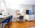 This charming and stylish studio apartment offers a delightful blend of comfort and convenience, perfectly situated just minutes from Central Park. Located on the third floor of a walk-up building, you'll need to climb three flights of stairs to reach your new home. Designed with your comfort in mind, the apartment features a cozy queen-size bed, a stylish leather sofa, a desk, a mirror, and air conditioning. The fully equipped kitchen invites you to cook up a storm with a large refrigerator, stovetop, oven, coffee maker, toaster, microwave, and all the utensils and cutlery you need. Relax in the marble bathroom, complete with a shower and bathtub. Convenient laundry facilities are available in the basement, and all bed linen and towels, as well as an iron and hairdryer, are provided. Unbeatable location near the Q train at 72nd Street subway station (2-minute walk) and the 6 train at 77th Street subway station (8-minute walk). A City Bike station is just 200 meters away for an easy and eco-friendly way to explore the city. Surrounded by a variety of restaurants right on the corner, you'll have endless dining options at your fingertips. The Upper East Side is renowned for its posh buildings, Madison Avenue's flagship boutiques, and proximity to some of the most fantastic museums in the country, including the Metropolitan Museum of Art and the Solomon R. Guggenheim Museum. Absolutely no smoking is allowed inside or outside of the apartment, and doing so will result in an automatic loss of security deposit. Pets are not allowed. Luggage storage is not available, so please use a service like to store your luggage before check-in or after check-out. All guests must respect quiet hours ranging from 10 pm to 7 am. The apartment must be used for vacation purposes only, with no commercial use allowed. You cannot receive mail at this address, so please consider opening a PO Box. Kindly note that a $350 refundable security deposit is required and will be collected directly by the partner after your booking is confirmed. The security deposit will be handled through direct communication with the partner and is not processed automatically.