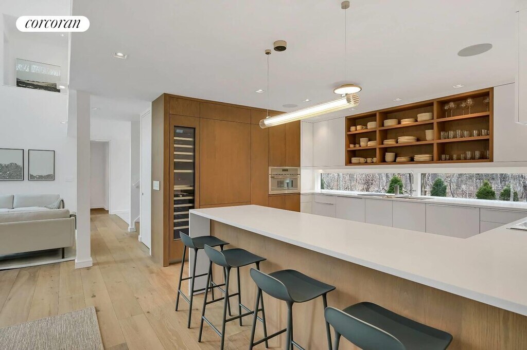 Designed by "Garcia / Maldonado, Inc. Interior Design and Architecture", an award winning architectural and interior design firm based in NYC and the Hamptons is located in the Northwest Woods, directly across from the Bay, it incorporates a sleek modern feel but with a warm California vibe. Sited well off the road on a shy acre, everything you would want as a summer rental is included. All bedrooms have ensuite bathrooms. The main level features a large living area bathed in light from stunning Clerestory windows along with numerous other windows. There is a sleek kitchen with top of the line appliances including a wine fridge and Caesarstone countertops - perfect for any chef. The main level also features a primary bedroom with ensuite bathroom which offers a soaking tub, walk in shower and private toilet. Rounding out the main level are a sunroom, a full service laundry room, a walk-in pantry and a full guest bathroom. There is another primary bedroom on the upper level, along with two additional guest bedrooms- all with ensuite bathrooms, and a large office with its own deck. The upstairs primary bedroom features a deck overlooking the front of the property with glimpses of the bay. The over sized bathroom offers a soaking tub, a super large walk-in shower and double sink vanity. There is a loft area overlooking the living room that sports a desk, sofa and another balcony. The lower level has a kitchenette, large media area and a full bathroom. Outdoor entertaining is a cinch with multiple seating areas on the large deck that spans the back of the house and leads to the heated salt water pool. Come spend your summer in the lap of luxury. This lovely residence is close to Bay beaches, East Hampton and Sag Harbor. [[Rental Registration # 24-182]]