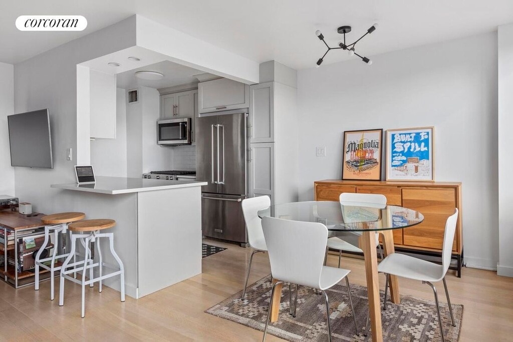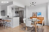Perched high in the building, this wonderful, spacious one bedroom apartment offers panoramic views of lower Manhattan, fabulous light and immaculate finishes throughout. The oversize living room with a dining alcove flows effortlessly. The open kitchen features stainless steel appliances, a counter that allows for dining and plenty of room to cook and entertain from. As you enter the apartment there is extended and spacious storage.The bedroom easily accommodates a king size bed and features a floor to ceiling headboard to add a stylish touch along with closet space and room for additional furniture. The apartment has been fully renovated with hardwood floors, noise cancelling windows and custom cabinetry. In addition soundproofing has been installed on the walls adjoining the next door apartments and is ready for you to make it home.333 E 14th Street is a well-managed co-op with a recently updated laundry room and lobby serviced by 2 elevators. Building amenities include a part-time doorman 7 days a week (2pm-10pm) and live-in superintendent and bike storage. Located between Gramercy and the East Village, the building offers convenient access to Trader Joe's, Whole Foods, Target and many stellar eateries. Transportation is super convenient with the L train stop at the corner, Union Square 4/5/6, N/Q/R trains are a few blocks away, along with access to multiple bus lines. Offered with a 12 month lease with an option to renew for another year. Heat & hot water included. Board Approval required.Application Fees Brokerage Application Fee $20 Additional Co-Op application fees will apply.
