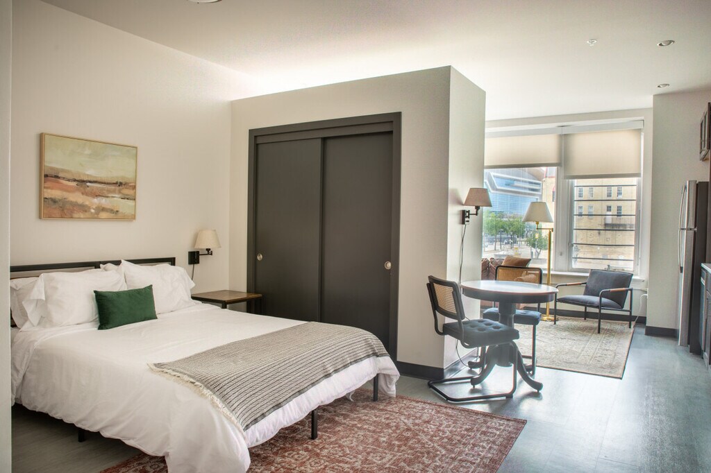 The advertised rate of $5,328/month is the lowest available price, based on a 30 day(s) stay with a move-in date of May 24, 2026. Rates vary depending on the duration of stay, season, and other parameters. For exact pricing and additional pricing components, please visit our website and enter your desired move-in and move-out dates. The rate is applicable when billed upfront; it can be higher if billed in multiple payments. Feel at home in this inviting, historic apartment situated in the most walkable, friendly neighborhood in the city. This apartment was created with comfort and ease in mind and features in-unit laundry, a fully equipped kitchen for baking or cooking, cozy corners to curl up with a book, fast Wi-Fi, a dedicated workspace, and table space for meals. The apartment sleeps two with a comfy queen bed and has flexible seating areas so you can work or relax at your convenience. The sofa may serve as additional sleeping space, however it does not have a pull-out bed. Enjoy self check-in, a smart TV with Airplay, high-speed Wi-Fi, a dining table, resident lounge and roof deck, co-working space, and fitness center. For reserved parking, Journal Commons Garage, 332 W State Lot, and Usinger Lot are recommended. Street parking is often available throughout the neighborhood: metered parking with a 2-hour time limit from 8am-4pm Mon-Sat, metered parking with no time limit from 4pm-9pm Mon-Sat, and free parking with no time limit on Sundays (use MKE Park app to remotely pay the meter). Overnight street parking requires a permit which you can request for free up to 3 nights by calling the city and requesting one. Just around the corner are loads of quality restaurants, cafes, coffee shops, a park, and easily accessible public transportation. Fiserv Forum and Baird Center are only a block away, making this an ideal location for people in town for business or pleasure. Also walkable to Pabst Theater, Marcus Performing Arts Center, 3rd St. Market Hall, and countless restaurants and bars. In the heart of the Deer District just one block from both Fiserv Forum and Baird Center. No smoking of any kind is allowed anywhere on the premises including outdoor spaces ($150 fine will be assessed and additional fees for remediation may apply). Quiet time is after 10pm. Guests must cover the cost to replace unreturned access devices such as keys, key cards, fobs, or parking passes. Guests take full responsibility for loss, injury, or damages that occur on the premises and its facilities. Bookings by local guests are prohibited at this property. [SI]
