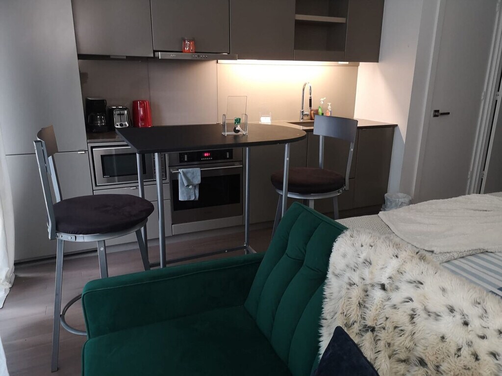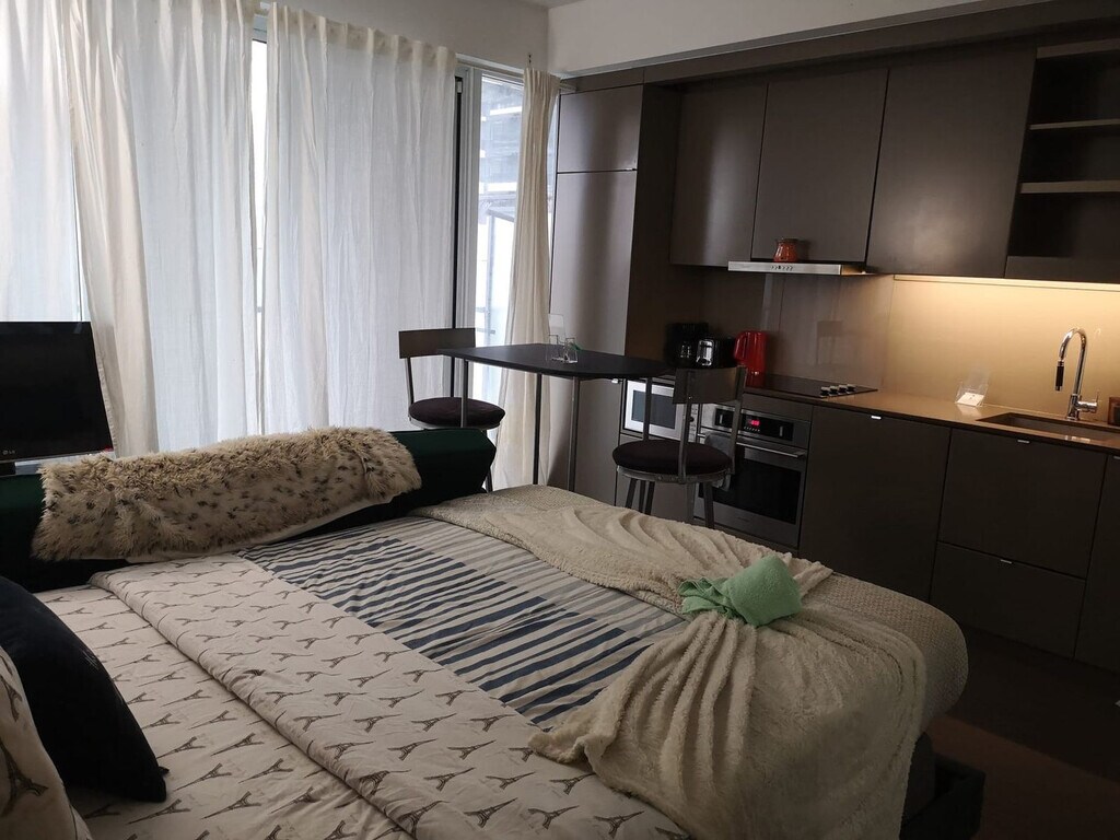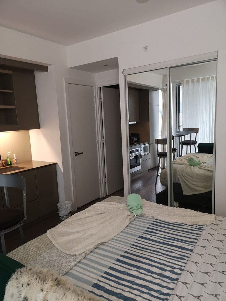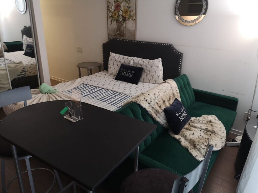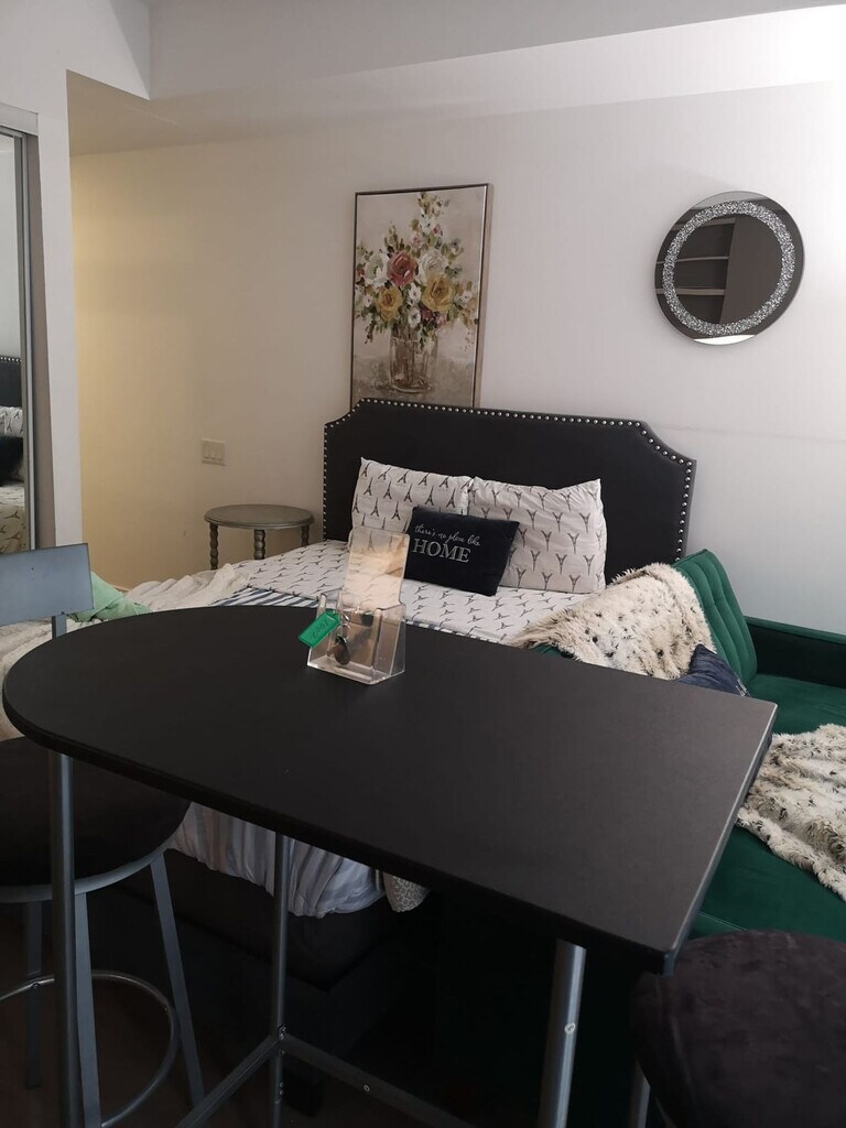 Feel at home in this beautifully designed studio that has everything you need to spend a relaxing, good quality time. This condo has a full washroom with a bathtub, a stand-up shower combo, in-suite laundry (washer-dryer combo), and a fully equipped kitchen. [SI]