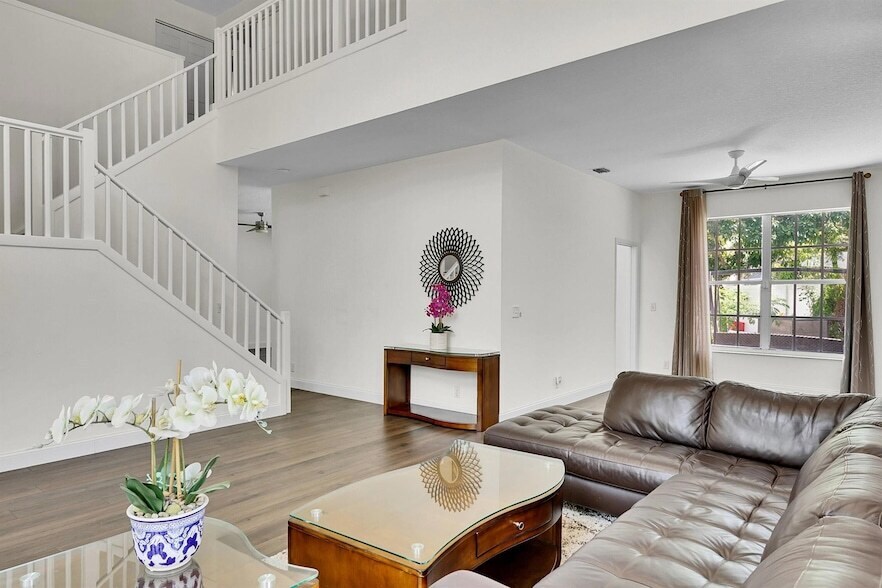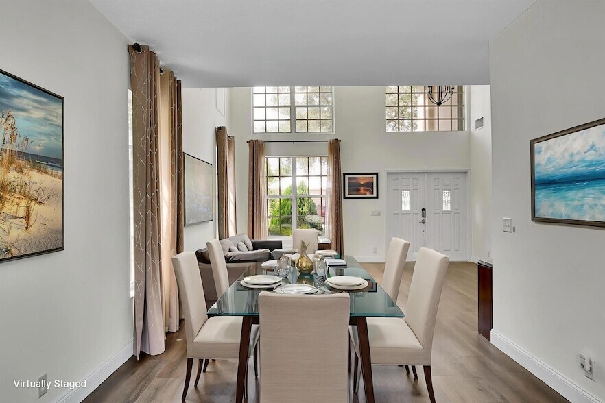 Spacious 4BR, 2.5BA home with 2,226 sq ft. & a 2 car garage with a Tesla charging station! Located in a gated community near shopping & highways. Enjoy peace of mind with a 2021 roof, new 5 ton A/C, and complete accordion shutters. Interior features stunning new luxury waterproof vinyl flooring throughout. New stainless appliances, granite countertops in kitchen, newer impact garage door & impact sliders going to the patio. Half bath downstairs was updated with a floating vanity & LED mirror. Relax in the screened patio-marble floors on the back patio & front patio. Pick fresh fruit from your own fenched backyard with many fruit trees. Perfect blend of comfort, convenience, and security--ideal for modern living!