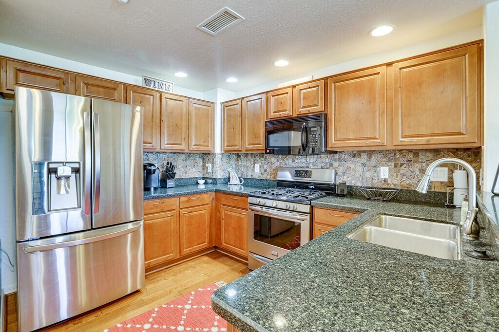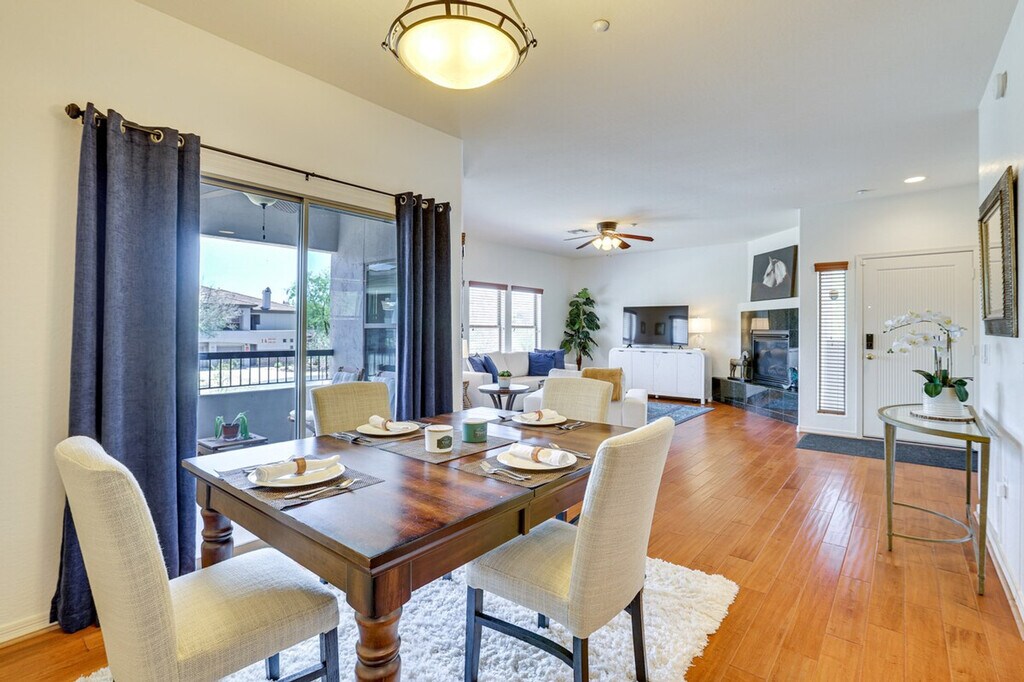 Feel at home in this golf-side Cave Creek vacation rental in the Villagio at Dove Valley Ranch gated community. This single-story, 2-bedroom, 2-bath condo is located on the second floor and requires an exterior staircase to enter. Start your days with desert skies and end them with sunset views over the 18th fairway. This condo is designed for extended stays and features 2 smart TVs, an en-suite bathroom and walk-in closet in bedroom 1, and a balcony. The kitchen is equipped with a refrigerator, stove/oven, dishwasher, Keurig, blender, microwave, cooking basics, dishware and flatware, trash bags and paper towels, a dining table, and spices. Additional amenities include free Wi-Fi, central air conditioning and heating, ceiling fans, a washer, dryer, iron and board, hangers, linens and towels, body wash, and a hair dryer. Guests have access to the outdoor heated pool which is open year-round, a hot tub, and 2 gas grills. One garage parking spot is available for one vehicle. Free street parking is available on a first-come, first-served basis. The driveway is not available for guest use. RV/trailer parking is not permitted. With a front-row seat to Sonoran serenity, this condo is near the Dove Valley Ranch Golf Club. Cool off in the community pool and toast the evening at a downtown saloon. Tee boxes, trails, and tranquility await! No smoking, pets, events, parties, or large gatherings are allowed. Additional fees and taxes may apply. A photo ID may be required upon check-in. Includes a workspace in bedroom 2. [SI]