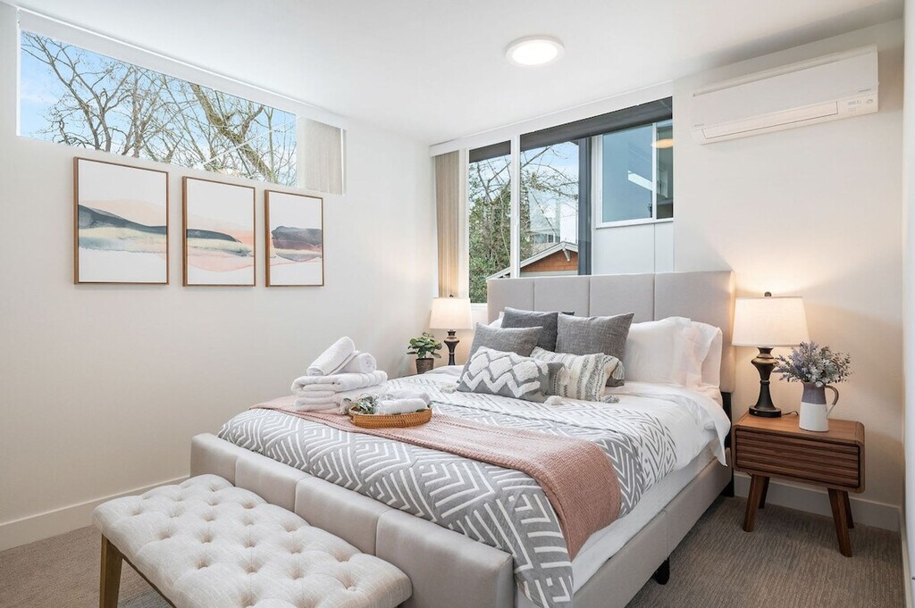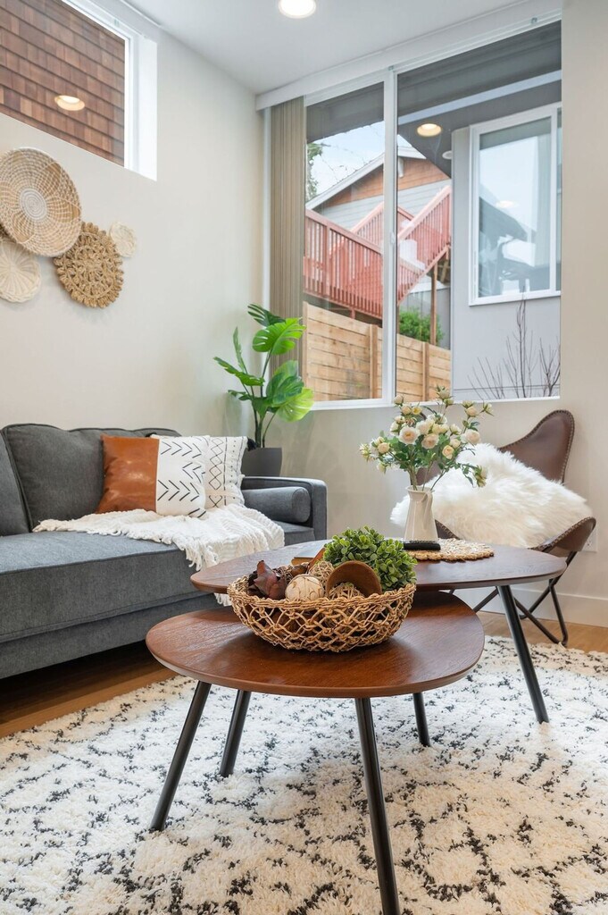 Feel at home in this recently built 3-bedroom, 2-bathroom townhouse in the lively, yet peaceful Queen Anne neighborhood of Seattle. This 4-level townhome, approximately 1100 sqft, includes a rooftop deck and a set of stairs leading up to the entry. The kitchen is fully stocked with kitchen appliances, cookware, silverware, servingware, spices, Keurig coffee and tea. Enjoy the rooftop patio with comfortable outdoor furniture, high-quality beds, mattresses, pillows, linens, and an on-site washer and dryer. Well-trained pets are welcome at $50 per pet per night. Conveniently located next to Seattle Pacific University, this home is just minutes away from Lake Union, multiple bus options, and biking trails, making it easy to explore local restaurants, cafes, and Queen Anne's rich architecture. Upper Queen Anne is known for its scenic views, historic architecture, and Kerry Park. Explore quaint shops, local cafes, and fine dining options. It's close to top attractions like the Space Needle, offering a peaceful yet vibrant atmosphere. With a high walk score and many dining, shopping, and entertainment options within walking distance, this location is ideal. This is a pet-friendly home, but please refrain from allowing pets on furniture and linens, and do not leave pets unattended. Please bring poop bags and pick up after your pets. Strictly no parties and events, quiet hours are between 10 pm and 8 am, no smoking or vaping of any kind anywhere on the property including outdoor areas, no digital piracy, and no shoes in the home. There is a $500 fine per violation. The home does not have dedicated parking. Street parking is free and the neighborhood is safe. Floor Plan: • First Floor: Dining room, kitchen, living room with Smart TV with AC • Second Floor: 2 bedrooms with queen bed/full bed, bathroom • Third Floor: Primary bedroom with Queen bed with AC, en-suite bath and walk-in closet, laundry • Fourth Floor: Rooftop deck with territorial views. Registration Number: STR-OPLI-22-000555 [SI]