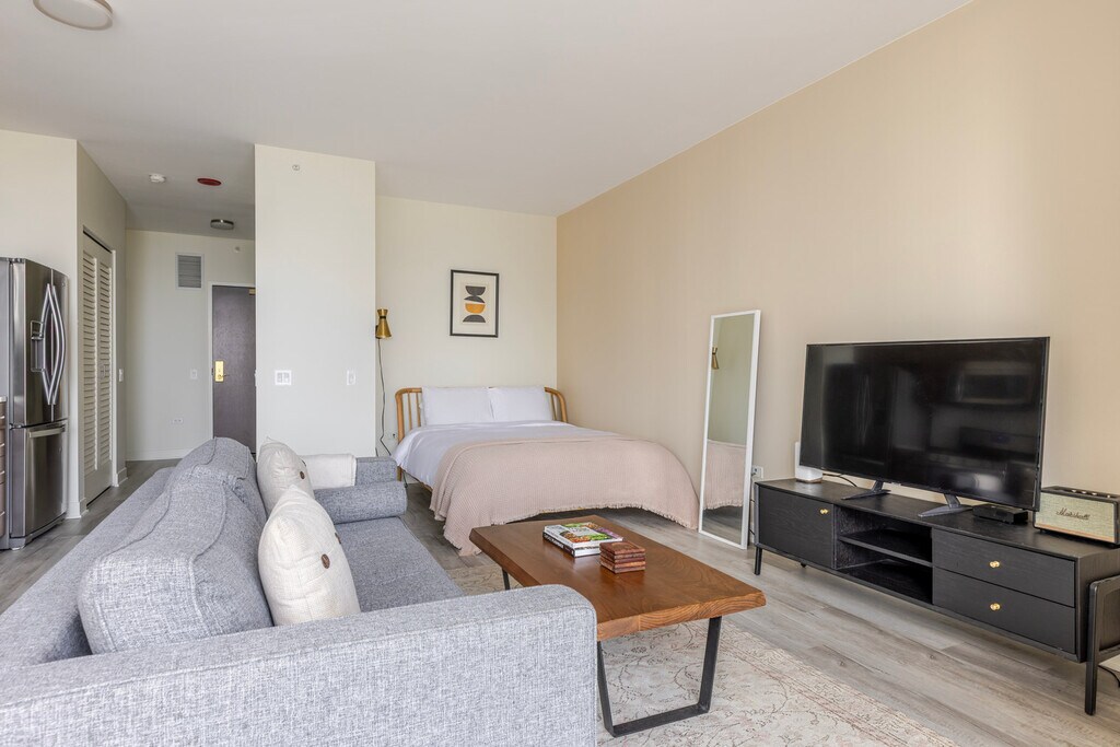 Similar space, but different These photos are of a similar space and style to this apartment. They’re intended to give you a sense of Blueground’s design style. Exact furniture and layout will be different. Be the first to rent! Discover the best of Chicago, with this studio apartment in Streeterville. It’ll be easy to simply show up and start living in this elegantly furnished apartment with its fully equipped kitchen, sophisticated living room, and our dedicated, on-the-ground support. (ID #CHI1418) The advertised rate of $2,610/month is the lowest available price, based on a 11 month(s) and 29 day(s) stay with a move-in date of January 28, 2026. Rates vary depending on the duration of stay, season, and other parameters. For exact pricing and additional pricing components, please visit our website and enter your desired move-in and move-out dates. The rate is applicable when billed upfront; it can be higher if billed in multiple payments. Brokers are welcome to reach out. Were you looking for an unfurnished lease? Try Blueground instead and upgrade from unfurnished to furnished living: - Furnished at rates comparable to unfurnished - No setup or furniture costs - save thousands - Move-in ready - save time, just bring your suitcase Designed with you in mind As with any Blueground apartment, you’ll find a thoughtfully designed space complete with beautiful furniture and a fully equipped kitchen in this studio property. And, thanks to our superior quality mattresses, luxury linens, and towels, you can relax knowing you’ll always feel comfortably at home. When you’re ready for some fun, you can take in the Chicago vibes or bring the entertainment to you with the premium wireless speaker or smart TV. This apartment also offers in-apartment laundry. Sleeping arrangements Queen Bed, 63in/160cm Amenities Building amenities unique to this studio apartment include an on-site: - Doorman - Dryer - Elevator - Swimming pool - Washing machine - Pets allowed Arrival and ongoing support The entire apartment is yours to enjoy! Throughout your stay, you’ll have access to our Client Experience team through the Blueground App. You can schedule additional cleanings, submit maintenance requests, and view our neighborhood recommendations with just a few taps. We’ll share all details upon confirmation of your stay. Ideally Located This furnished rental is located in Streeterville, only a 5 minute walk from The Loop. One of the fastest-developing neighborhoods in Chicago, Streeterville extends out into Lake Michigan and attracts a blend of young professionals, students, and tourists. A plethora of amenities and activities exist for every lifestyle. From Navy Pier activities to luxury shopping on Michigan Avenue, it is a walkable community with easy access to entertainment. Other things to note Building amenities may have an extra cost. Photos are from a similar property. This Blueground apartment has flexible lease options, allowing you to book it for one month, a year, or more. Pets are welcome, though weight limits and breed restrictions apply and may incur fees. [SI]