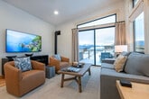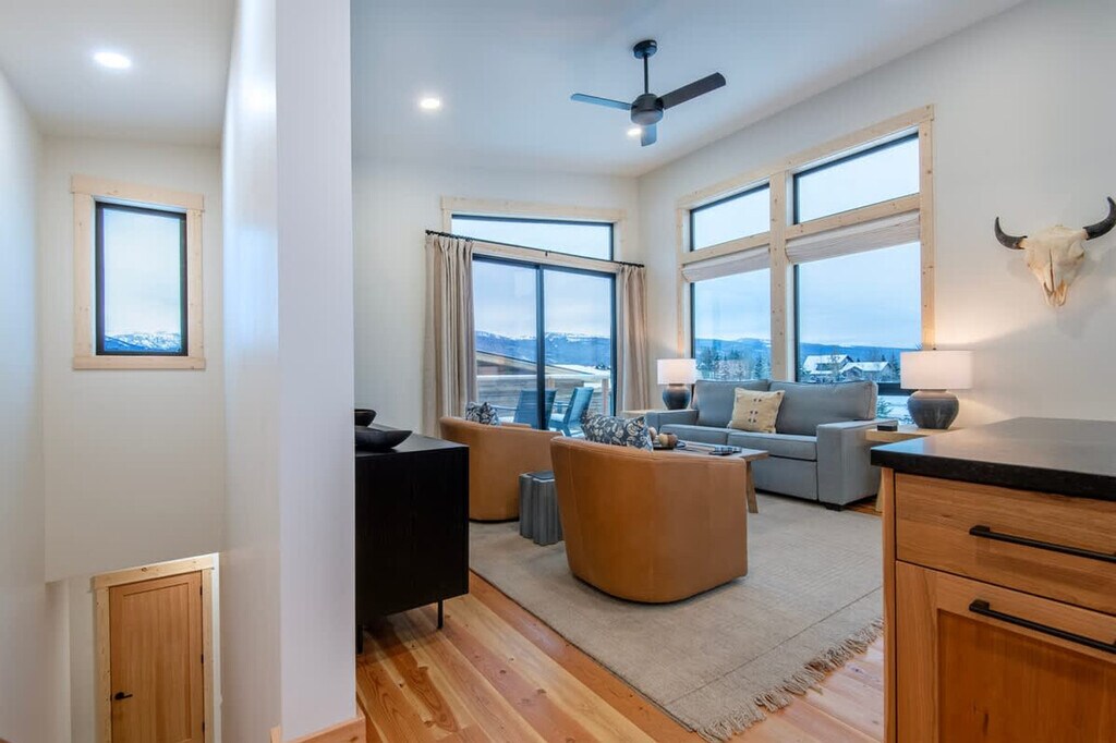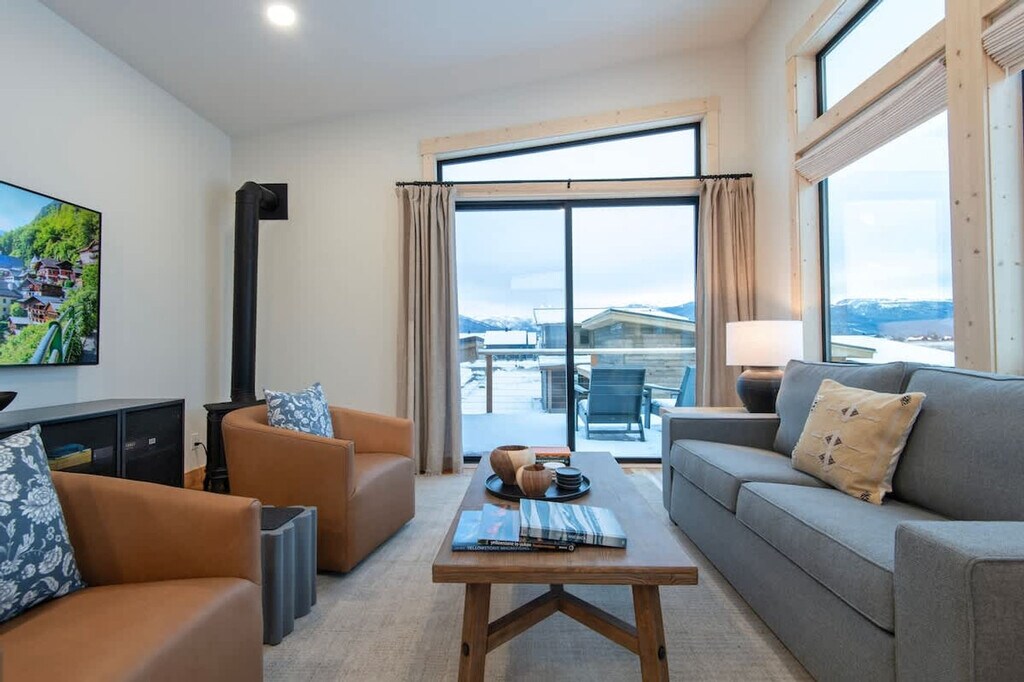 Nestled at the base of the Teton Mountains, this modern guest house offers a stylish and cozy retreat with breathtaking Teton views. Designed for comfort and convenience, it provides the perfect home base for skiing, hiking, or simply unwinding in nature, all while being ideally located just north of Driggs. This inviting space combines comfort with style, featuring a king bedroom and a bunk room with twin and queen beds, making it perfect for families, couples, or friends. The spacious living room boasts a cozy propane fireplace, a large smart TV, and floor-to-ceiling windows showcasing stunning Teton views. The fully equipped kitchen has everything you need to cook meals, plus bar seating for four and a dining area with bench seating. For those who need to stay connected, there's a dedicated office space in the bunk room. A full washer and dryer are available in the laundry room for your convenience, and the expansive deck offers elevated Teton views, perfect for morning coffee or an evening unwind. The property features two homes, primarily renting out the main home. However, the main home and guest home can be rented as one rental for larger groups needing more space. Stay close to everything Teton Valley has to offer. Enjoy summer adventures like Teton River floats and fishing just minutes away, world-class mountain biking and hiking on stunning Teton Valley trails, and scenic chairlifts, hiking, and summer concerts at Grand Targhee Resort, only 15 minutes away. Downtown Driggs offers great restaurants, breweries, and boutique shopping. In winter, experience legendary deep powder and a laid-back atmosphere at Grand Targhee Resort, just 15 minutes away, or explore some of the best skiing and snowboarding in the country at Jackson Hole and Teton Pass. Snowmobiling and Nordic skiing offer endless backcountry access right from your doorstep. The property has important house rules to ensure a safe and enjoyable stay. Quiet hours are from 9 pm to 8 am, and no events, parties, or large gatherings are allowed. Smoking or vaping in the home or on the decks is prohibited, with an additional charge applied if any butts are found on the property. Exterior lights should be turned off at night to preserve the dark skies. A maximum of two licensed vehicles is allowed in the driveway and garages. Riding snow machines, dirt bikes, or ATVs in the subdivision or at the rental property is not permitted, and no fireworks are allowed on the premises. All main entry doors should be locked when not occupied. Fines will apply for violations, including smoking in the house or garage, failure to follow house rules, and mistreatment of the hot tub, with a minimum $500 fine for smoking/vaping/marijuana in the house or garage, violation of house rules, posted signs, laws, or failure to vacate at check-out time. The apartment is remote work-friendly with a dedicated office space in the bunk room, ensuring you can stay connected during your stay.