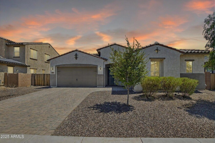 Spacious split floorplan home features 4 bedrooms with walk-in closets, 3 full bathrooms, 10 ft. ceilings, office/flex room, and formal dining room. Kitchen showcases 42'' birch cabinets, quartz counters and backsplash, 5 burner gas stove, single bowl sink, pendent lights, recessed lighting, RO system, walk-in pantry, breakfast nook, and center island with breakfast bar. Gorgeous primary suite measures 17'7''x14'. En suite has large W.I.C., center bank dual sink vanity, soaking tub, linen closet, walk-in shower with bench and rain showerhead. Private backyard with no neighbors behind. Home boarders a walking/biking path. Separate 1-car garage with door entrance is perfect for storage or a 3rd car. The 2-car garage has a utility door that opens to RV gate. The 427 acre master-planned community features scenic walking/biking paths, sand volleyball courts, basketball courts, soccer field, baseball backstop, ramadas with picnic tables, schools, tot lots, 10+ shaded playgrounds, and large greenbelts. Home is conveniently located near schools, parks, retail, restaurants, entertainment, Spring Training, Goodyear Civic Center, Goodyear Recreation Center, I-10, and loop 303.