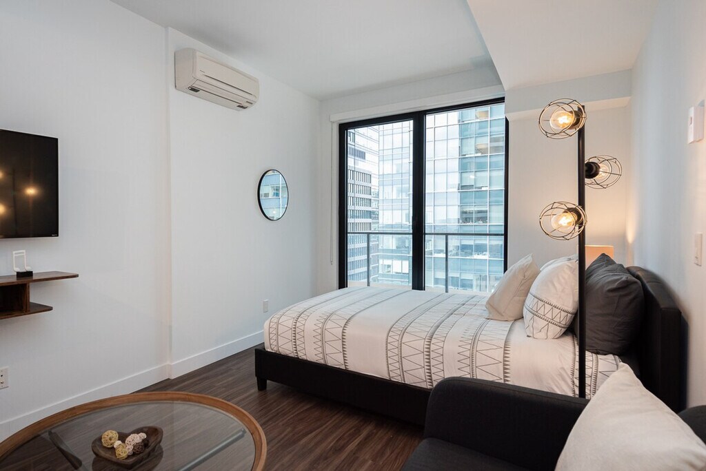 Located in the bustling downtown core of Montreal, adjacent to the Bell Centre, this property epitomizes luxury and practicality, setting a new benchmark for urban living, especially tailored for young professionals, newcomers, and students. Situated mere steps away, you will enjoy easy access to the attractions of the Golden Square Mile and the historic charm of Old Montreal, fostering an environment ideal for both academic pursuits and professional development. This new condo is very well located near the Bell Centre, just steps away from the Golden Square Mile’s attractions. The studio room features a queen bed and a bathroom. The apartment offers a studio room with a queen bed and a bathroom. Indoor parking with in and out privileges is available for an additional fee, depending on your length of stay. A variety of cleaning services, including bi-weekly or monthly, are offered for an extra charge. Situated mere steps away, you will enjoy easy access to the attractions of the Golden Square Mile and the historic charm of Old Montreal, fostering an environment ideal for both academic pursuits and professional development. No parties of any kind or loud noises that can alter the harmony of residents are allowed. No smoking of cannabis, cigarettes, or any kind inside the apartment, balcony, or the building. Please care about your home away from home. Shared workspaces and a conference room are available, along with a workspace offering a view, making it ideal for remote work.